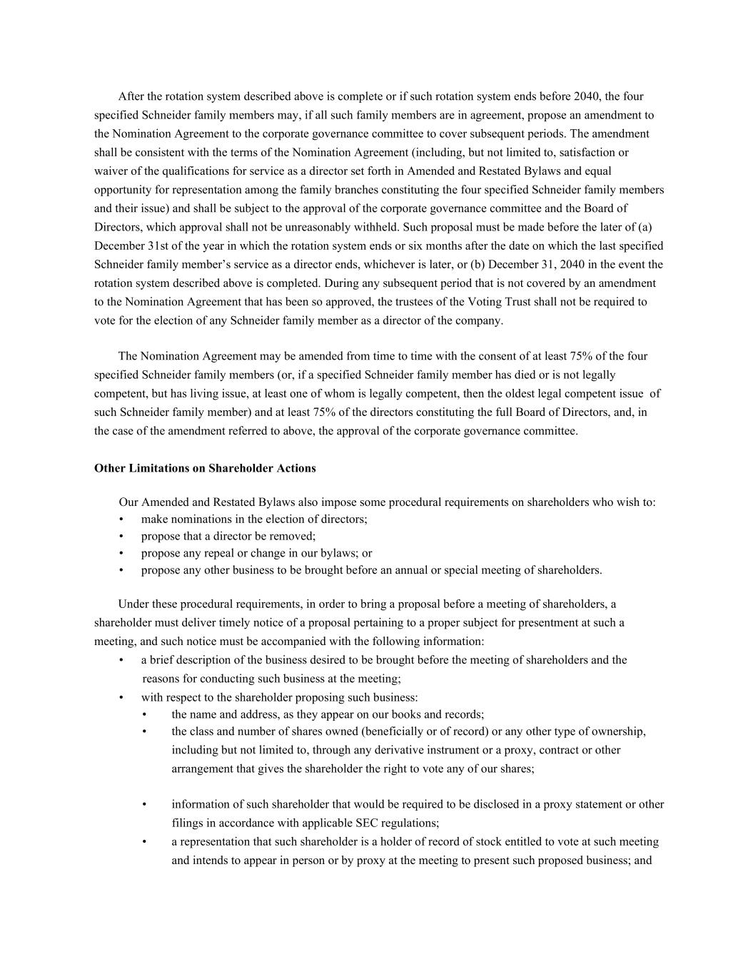 After the rotation system described above is complete or if such rotation system ends before 2040, the four specified Schneider family members may, if all such family members are in agreement, propose an amendment to the Nomination Agreement to the corporate governance committee to cover subsequent periods. The amendment shall be consistent with the terms of the Nomination Agreement (including, but not limited to, satisfaction or waiver of the qualifications for service as a director set forth in Amended and Restated Bylaws and equal opportunity for representation among the family branches constituting the four specified Schneider family members and their issue) and shall be subject to the approval of the corporate governance committee and the Board of Directors, which approval shall not be unreasonably withheld. Such proposal must be made before the later of (a) December 31st of the year in which the rotation system ends or six months after the date on which the last specified Schneider family member’s service as a director ends, whichever is later, or (b) December 31, 2040 in the event the rotation system described above is completed. During any subsequent period that is not covered by an amendment to the Nomination Agreement that has been so approved, the trustees of the Voting Trust shall not be required to vote for the election of any Schneider family member as a director of the company. The Nomination Agreement may be amended from time to time with the consent of at least 75% of the four specified Schneider family members (or, if a specified Schneider family member has died or is not legally competent, but has living issue, at least one of whom is legally competent, then the oldest legal competent issue of such Schneider family member) and at least 75% of the directors constituting the full Board of Directors, and, in the case of the amendment referred to above, the approval of the corporate governance committee. Other Limitations on Shareholder Actions Our Amended and Restated Bylaws also impose some procedural requirements on shareholders who wish to: • make nominations in the election of directors; • propose that a director be removed; • propose any repeal or change in our bylaws; or • propose any other business to be brought before an annual or special meeting of shareholders. Under these procedural requirements, in order to bring a proposal before a meeting of shareholders, a shareholder must deliver timely notice of a proposal pertaining to a proper subject for presentment at such a meeting, and such notice must be accompanied with the following information: • a brief description of the business desired to be brought before the meeting of shareholders and the reasons for conducting such business at the meeting; • with respect to the shareholder proposing such business: • the name and address, as they appear on our books and records; • the class and number of shares owned (beneficially or of record) or any other type of ownership, including but not limited to, through any derivative instrument or a proxy, contract or other arrangement that gives the shareholder the right to vote any of our shares; • information of such shareholder that would be required to be disclosed in a proxy statement or other filings in accordance with applicable SEC regulations; • a representation that such shareholder is a holder of record of stock entitled to vote at such meeting and intends to appear in person or by proxy at the meeting to present such proposed business; and