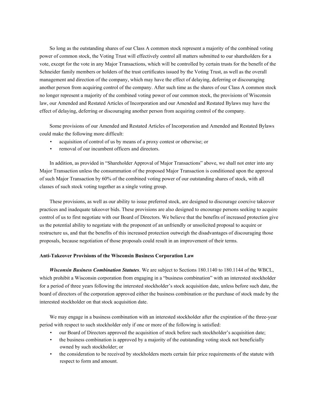 So long as the outstanding shares of our Class A common stock represent a majority of the combined voting power of common stock, the Voting Trust will effectively control all matters submitted to our shareholders for a vote, except for the vote in any Major Transactions, which will be controlled by certain trusts for the benefit of the Schneider family members or holders of the trust certificates issued by the Voting Trust, as well as the overall management and direction of the company, which may have the effect of delaying, deferring or discouraging another person from acquiring control of the company. After such time as the shares of our Class A common stock no longer represent a majority of the combined voting power of our common stock, the provisions of Wisconsin law, our Amended and Restated Articles of Incorporation and our Amended and Restated Bylaws may have the effect of delaying, deferring or discouraging another person from acquiring control of the company. Some provisions of our Amended and Restated Articles of Incorporation and Amended and Restated Bylaws could make the following more difficult: • acquisition of control of us by means of a proxy contest or otherwise; or • removal of our incumbent officers and directors. In addition, as provided in “Shareholder Approval of Major Transactions” above, we shall not enter into any Major Transaction unless the consummation of the proposed Major Transaction is conditioned upon the approval of such Major Transaction by 60% of the combined voting power of our outstanding shares of stock, with all classes of such stock voting together as a single voting group. These provisions, as well as our ability to issue preferred stock, are designed to discourage coercive takeover practices and inadequate takeover bids. These provisions are also designed to encourage persons seeking to acquire control of us to first negotiate with our Board of Directors. We believe that the benefits of increased protection give us the potential ability to negotiate with the proponent of an unfriendly or unsolicited proposal to acquire or restructure us, and that the benefits of this increased protection outweigh the disadvantages of discouraging those proposals, because negotiation of those proposals could result in an improvement of their terms. Anti-Takeover Provisions of the Wisconsin Business Corporation Law Wisconsin Business Combination Statutes. We are subject to Sections 180.1140 to 180.1144 of the WBCL, which prohibit a Wisconsin corporation from engaging in a “business combination” with an interested stockholder for a period of three years following the interested stockholder’s stock acquisition date, unless before such date, the board of directors of the corporation approved either the business combination or the purchase of stock made by the interested stockholder on that stock acquisition date. We may engage in a business combination with an interested stockholder after the expiration of the three-year period with respect to such stockholder only if one or more of the following is satisfied: • our Board of Directors approved the acquisition of stock before such stockholder’s acquisition date; • the business combination is approved by a majority of the outstanding voting stock not beneficially owned by such stockholder; or • the consideration to be received by stockholders meets certain fair price requirements of the statute with respect to form and amount.
