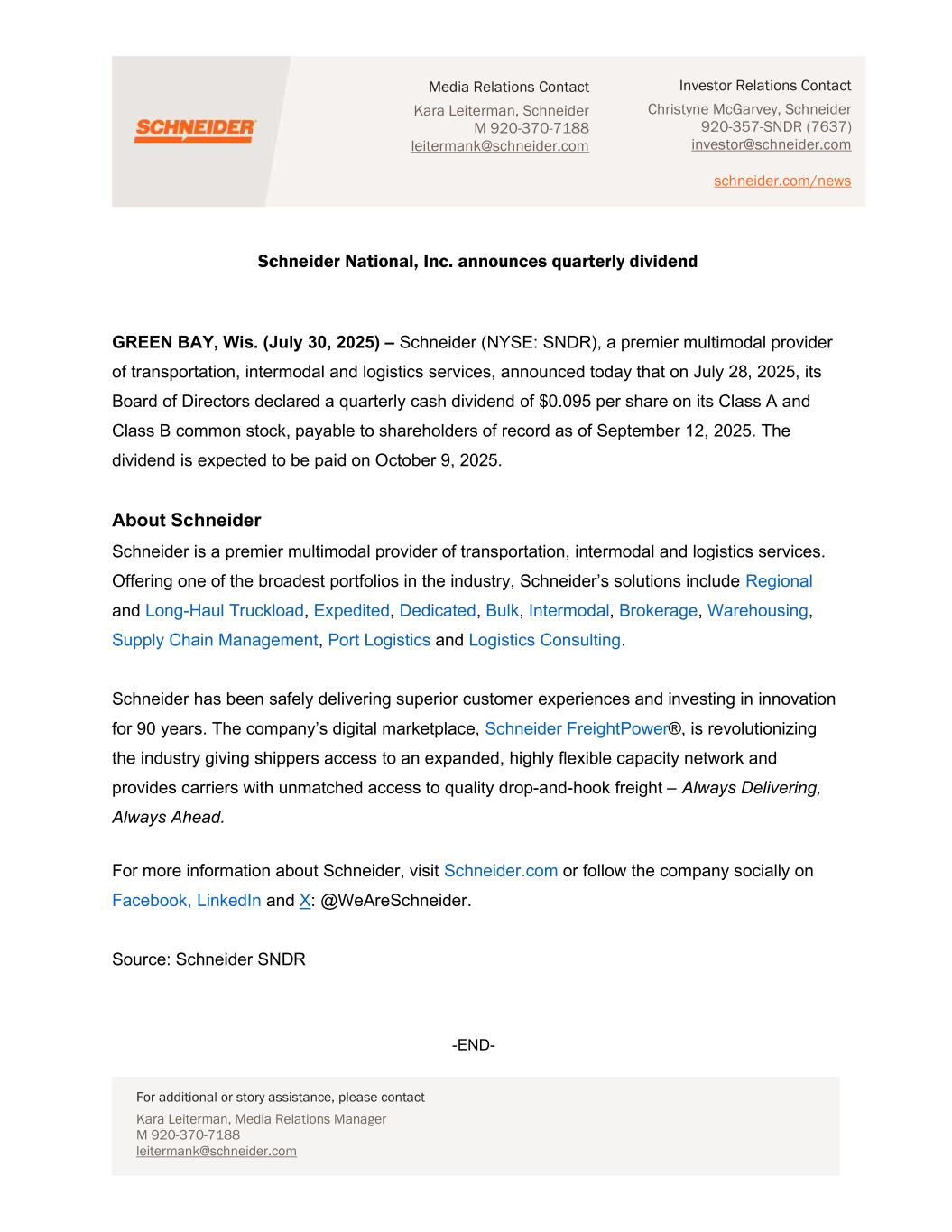 Media Relations Contact Kara Leiterman, Schneider M 920-370-7188 leitermank@schneider.com For additional or story assistance, please contact Kara Leiterman, Media Relations Manager M 920-370-7188 leitermank@schneider.com Investor Relations Contact Christyne McGarvey, Schneider 920-357-SNDR (7637) investor@schneider.com schneider.com/news Schneider National, Inc. announces quarterly dividend GREEN BAY, Wis. (July 30, 2025) – Schneider (NYSE: SNDR), a premier multimodal provider of transportation, intermodal and logistics services, announced today that on July 28, 2025, its Board of Directors declared a quarterly cash dividend of $0.095 per share on its Class A and Class B common stock, payable to shareholders of record as of September 12, 2025. The dividend is expected to be paid on October 9, 2025. About Schneider Schneider is a premier multimodal provider of transportation, intermodal and logistics services. Offering one of the broadest portfolios in the industry, Schneider’s solutions include Regional and Long-Haul Truckload, Expedited, Dedicated, Bulk, Intermodal, Brokerage, Warehousing, Supply Chain Management, Port Logistics and Logistics Consulting. Schneider has been safely delivering superior customer experiences and investing in innovation for 90 years. The company’s digital marketplace, Schneider FreightPower®, is revolutionizing the industry giving shippers access to an expanded, highly flexible capacity network and provides carriers with unmatched access to quality drop-and-hook freight – Always Delivering, Always Ahead. For more information about Schneider, visit Schneider.com or follow the company socially on Facebook, LinkedIn and X: @WeAreSchneider. Source: Schneider SNDR -END-
