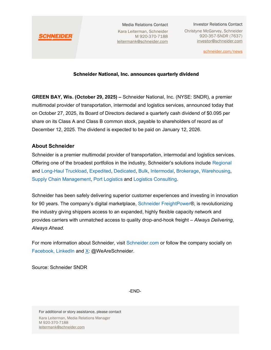Media Relations Contact Kara Leiterman, Schneider M 920-370-7188 leitermank@schneider.com For additional or story assistance, please contact Kara Leiterman, Media Relations Manager M 920-370-7188 leitermank@schneider.com Investor Relations Contact Christyne McGarvey, Schneider 920-357-SNDR (7637) investor@schneider.com schneider.com/news Schneider National, Inc. announces quarterly dividend GREEN BAY, Wis. (October 29, 2025) – Schneider National, Inc. (NYSE: SNDR), a premier multimodal provider of transportation, intermodal and logistics services, announced today that on October 27, 2025, its Board of Directors declared a quarterly cash dividend of $0.095 per share on its Class A and Class B common stock, payable to shareholders of record as of December 12, 2025. The dividend is expected to be paid on January 12, 2026. About Schneider Schneider is a premier multimodal provider of transportation, intermodal and logistics services. Offering one of the broadest portfolios in the industry, Schneider’s solutions include Regional and Long-Haul Truckload, Expedited, Dedicated, Bulk, Intermodal, Brokerage, Warehousing, Supply Chain Management, Port Logistics and Logistics Consulting. Schneider has been safely delivering superior customer experiences and investing in innovation for 90 years. The company’s digital marketplace, Schneider FreightPower®, is revolutionizing the industry giving shippers access to an expanded, highly flexible capacity network and provides carriers with unmatched access to quality drop-and-hook freight – Always Delivering, Always Ahead. For more information about Schneider, visit Schneider.com or follow the company socially on Facebook, LinkedIn and X: @WeAreSchneider. Source: Schneider SNDR -END-