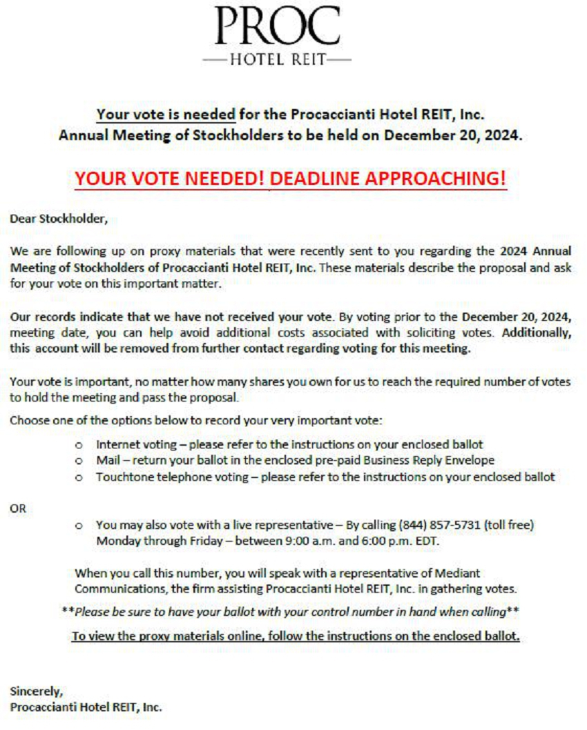 | Scan QR for digital voting Copyright © 2024 BetaNXT, Inc. or its affiliates. All Rights Reserved styleIPC This proxy is being solicited on behalf of the Board of Directors The undersigned stockholder of Procaccianti Hotel REIT, Inc., a Maryland corporation, hereby appoints James A. Procaccianti, Gregory Vickowski, and Ron Hadar, and each of them, as proxies of the undersigned with full power of substitution in each of them as determined by the Board of Directors of Procaccianti Hotel REIT, Inc. on behalf and in the name of the undersigned, to attend the 2024 Annual Meeting of Stockholders of Procaccianti Hotel REIT, Inc. to be held on December 20, 2024 at 10:00 a.m. (ET), at the offices of Procaccianti Hotel REIT, Inc., located at 1140 Reservoir Avenue, Cranston, RI 02920-6320 and any and all adjournments and postponements thereof, and to cast on behalf of the undersigned all votes which the undersigned would be entitled to cast if personally present, as indicated on the reverse side of this ballot, and otherwise to represent the undersigned at the meeting and any adjournments or postponements thereof, with all power possessed by the undersigned as if personally present and to vote in their discretion on such other matters as may properly come before the meeting. The undersigned hereby acknowledges receipt of the Notice of Annual Meeting of Stockholders and of the accompanying proxy statement, which is hereby incorporated by reference, and revokes any proxy heretofore given with respect to such meeting. THE SHARES REPRESENTED BY THIS PROXY WILL BE VOTED AS DIRECTED OR, IF NO DIRECTION IS GIVEN, SHARES WILL BE VOTED IDENTICAL TO THE BOARD OF DIRECTORS' RECOMMENDATION. This proxy, when properly executed, will be voted in the manner directed herein. In their discretion, the Named Proxies are authorized to vote upon such other matters that may properly come before the meeting or any adjournment or postponement thereof. You are encouraged to specify your choice by marking the appropriate box (SEE REVERSE SIDE) but you need not mark any box if you wish to vote in accordance with the Board of Directors’ recommendation. The Named Proxies cannot vote your shares unless you sign (on the reverse side) and return this card. PLEASE BE SURE TO SIGN AND DATE THIS PROXY CARD AND MARK ON THE REVERSE SIDE PROCACCIANTI HOTEL REIT, INC. Annual Meeting of Stockholders For Stockholders of record as of October 3, 2024 Friday, December 20, 2024 10:00 AM, Eastern Time 1140 Reservoir Avenue, Cranston, RI, 02920-6320 PROXY TABULATOR PO BOX 8035 CARY, NC 27512-9916 P.O. BOX 8016, CARY, NC 27512-9903 Internet: www.proxypush.com/PROC • Cast your vote online • Have your Proxy Card ready • Follow the simple instructions to record your vote Phone: 1-866-256-0074 • Use any touch-tone telephone • Have your Proxy Card ready • Follow the simple recorded instructions Live Agent: 1-844-857-5731 Speak to a live agent and vote on a recorded line Mail: • Mark, sign and date your Proxy Card • Fold and return your Proxy Card in the postage-paid envelope provided YOUR VOTE IS IMPORTANT! PLEASE VOTE BY: 10:00 AM, Eastern Time, December 20, 2024. Have your ballot ready and please use one of the methods below for easy voting: Your vote matters! Have the 12 digit control number located in the box above available when you access the website and follow the instructions. Your control number |