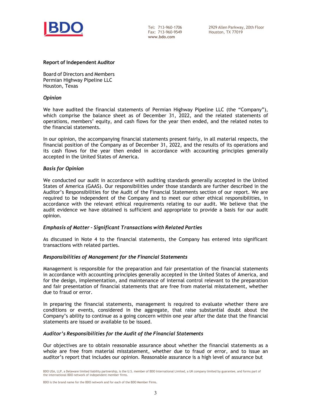 3 Tel: 713-960-1706 Fax: 713-960-9549 www.bdo.com 2929 Allen Parkway, 20th Floor Houston, TX 77019 Report of Independent Auditor Board of Directors and Members Permian Highway Pipeline LLC Houston, Texas Opinion We have audited the financial statements of Permian Highway Pipeline LLC (the “Company”), which comprise the balance sheet as of December 31, 2022, and the related statements of operations, members’ equity, and cash flows for the year then ended, and the related notes to the financial statements. In our opinion, the accompanying financial statements present fairly, in all material respects, the financial position of the Company as of December 31, 2022, and the results of its operations and its cash flows for the year then ended in accordance with accounting principles generally accepted in the United States of America. Basis for Opinion We conducted our audit in accordance with auditing standards generally accepted in the United States of America (GAAS). Our responsibilities under those standards are further described in the Auditor’s Responsibilities for the Audit of the Financial Statements section of our report. We are required to be independent of the Company and to meet our other ethical responsibilities, in accordance with the relevant ethical requirements relating to our audit. We believe that the audit evidence we have obtained is sufficient and appropriate to provide a basis for our audit opinion. Emphasis of Matter – Significant Transactions with Related Parties As discussed in Note 4 to the financial statements, the Company has entered into significant transactions with related parties. Responsibilities of Management for the Financial Statements Management is responsible for the preparation and fair presentation of the financial statements in accordance with accounting principles generally accepted in the United States of America, and for the design, implementation, and maintenance of internal control relevant to the preparation and fair presentation of financial statements that are free from material misstatement, whether due to fraud or error. In preparing the financial statements, management is required to evaluate whether there are conditions or events, considered in the aggregate, that raise substantial doubt about the Company’s ability to continue as a going concern within one year after the date that the financial statements are issued or available to be issued. Auditor’s Responsibilities for the Audit of the Financial Statements Our objectives are to obtain reasonable assurance about whether the financial statements as a whole are free from material misstatement, whether due to fraud or error, and to issue an auditor’s report that includes our opinion. Reasonable assurance is a high level of assurance but BDO USA, LLP, a Delaware limited liability partnership, is the U.S. member of BDO International Limited, a UK company limited by guarantee, and forms part of the international BDO network of independent member firms. BDO is the brand name for the BDO network and for each of the BDO Member Firms.