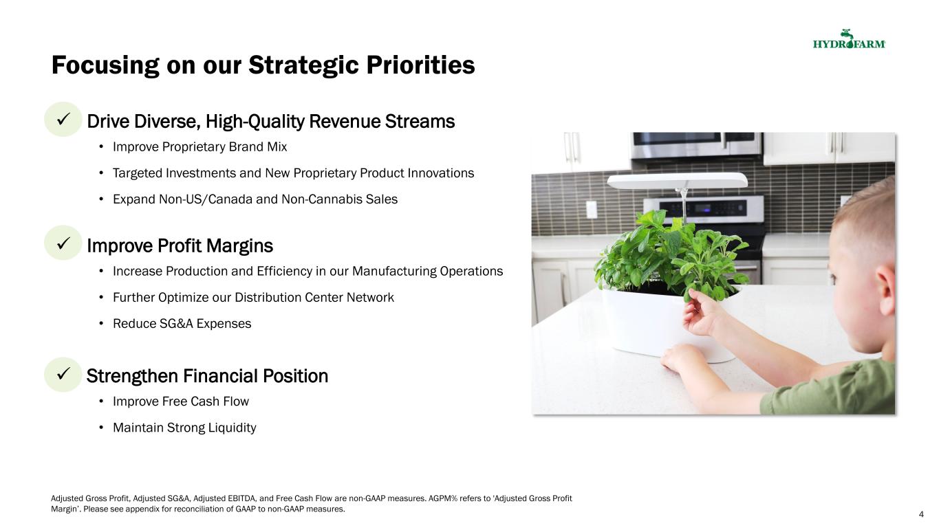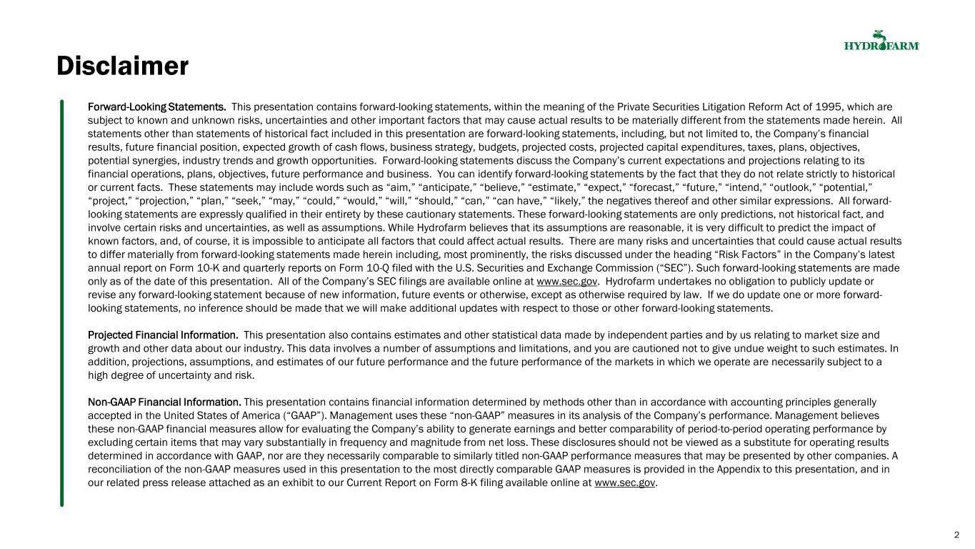 Disclaimer Forward-Looking Statements.  This presentation contains forward-looking statements, within the meaning of the Private Securities Litigation Reform Act of 1995, which are  subject to known and unknown risks, uncertainties and other important factors that may cause actual results to be materially different from the statements made herein.  All  statements other than statements of historical fact included in this presentation are forward-looking statements, including, but not limited to, the Company’s financial  results, future financial position, expected growth of cash flows, business strategy, budgets, projected costs, projected capital expenditures, taxes, plans, objectives,  potential synergies, industry trends and growth opportunities.  Forward-looking statements discuss the Company’s current expectations and projections relating to its  financial operations, plans, objectives, future performance and business.  You can identify forward-looking statements by the fact that they do not relate strictly to historical  or current facts.  These statements may include words such as “aim,” “anticipate,” “believe,” “estimate,” “expect,” “forecast,” “future,” “intend,” “outlook,” “potential,”  “project,” “projection,” “plan,” “seek,” “may,” “could,” “would,” “will,” “should,” “can,” “can have,” “likely,” the negatives thereof and other similar expressions. All forward- looking statements are expressly qualified in their entirety by these cautionary statements. These forward-looking statements are only predictions, not historical fact, and  involve certain risks and uncertainties, as well as assumptions. While Hydrofarm believes that its assumptions are reasonable, it is very difficult to predict the impact of  known factors, and, of course, it is impossible to anticipate all factors that could affect actual results.  There are many risks and uncertainties that could cause actual results  to differ materially from forward-looking statements made herein including, most prominently, the risks discussed under the heading “Risk Factors” in the Company’s latest  annual report on Form 10-K and quarterly reports on Form 10-Q filed with the U.S. Securities and Exchange Commission (“SEC”). Such forward-looking statements are made  only as of the date of this presentation.  All of the Company’s SEC filings are available online at www.sec.gov.  Hydrofarm undertakes no obligation to publicly update or  revise any forward-looking statement because of new information, future events or otherwise, except as otherwise required by law.  If we do update one or more forward- looking statements, no inference should be made that we will make additional updates with respect to those or other forward-looking statements.   Projected Financial Information.  This presentation also contains estimates and other statistical data made by independent parties and by us relating to market size and  growth and other data about our industry. This data involves a number of assumptions and limitations, and you are cautioned not to give undue weight to such estimates. In  addition, projections, assumptions, and estimates of our future performance and the future performance of the markets in which we operate are necessarily subject to a  high degree of uncertainty and risk. Non-GAAP Financial Information. This presentation contains financial information determined by methods other than in accordance with accounting principles generally  accepted in the United States of America (“GAAP”). Management uses these “non-GAAP” measures in its analysis of the Company’s performance. Management believes  these non-GAAP financial measures allow for evaluating the Company’s ability to generate earnings and better comparability of period-to-period operating performance by  excluding certain items that may vary substantially in frequency and magnitude from net loss. These disclosures should not be viewed as a substitute for operating results  determined in accordance with GAAP, nor are they necessarily comparable to similarly titled non-GAAP performance measures that may be presented by other companies. A  reconciliation of the non-GAAP measures used in this presentation to the most directly comparable GAAP measures is provided in the Appendix to this presentation, and in  our related press release attached as an exhibit to our Current Report on Form 8-K filing available online at www.sec.gov. 2
