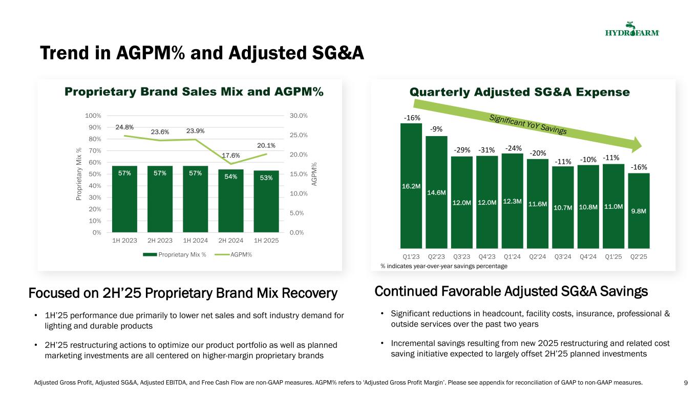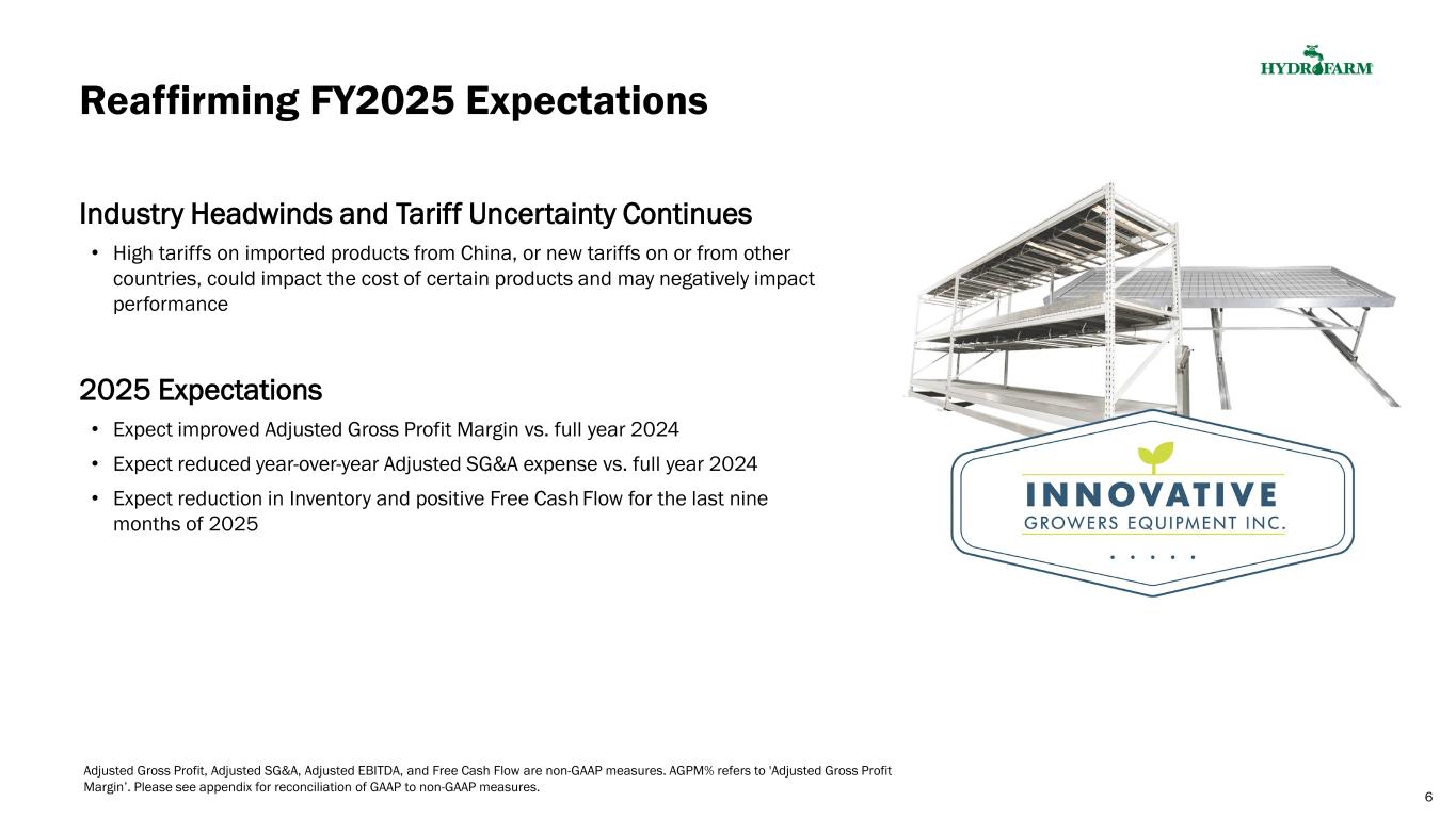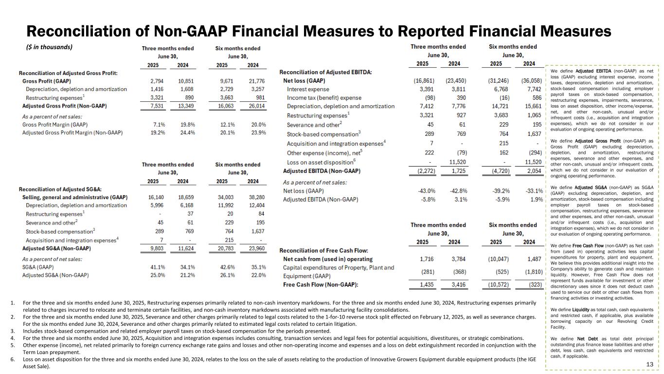 Reconciliation of Non-GAAP Financial Measures to Reported Financial Measures ($ in thousands) We define Adjusted EBITDA (non-GAAP) as net  loss (GAAP) excluding interest expense, income  taxes, depreciation, depletion and amortization,  stock-based compensation including employer  payroll taxes on stock-based compensation,  restructuring expenses, impairments, severance,  loss on asset disposition, other income/expense,  net, and other non-cash, unusual and/or  infrequent costs (i.e., acquisition and integration  expenses), which we do not consider in our  evaluation of ongoing operating performance. We define Adjusted Gross Profit (non-GAAP) as  Gross Profit (GAAP) excluding depreciation,  depletion, and amortization, restructuring  expenses, severance and other expenses, and  other non-cash, unusual and/or infrequent costs,  which we do not consider in our evaluation of  ongoing operating performance. We define Adjusted SG&A (non-GAAP) as SG&A  (GAAP) excluding depreciation, depletion, and  amortization, stock-based compensation including  employer payroll taxes on stock-based  compensation, restructuring expenses, severance  and other expenses, and other non-cash, unusual  and/or infrequent costs (i.e., acquisition and  integration expenses), which we do not consider in  our evaluation of ongoing operating performance. We define Free Cash Flow (non-GAAP) as Net cash  from (used in) operating activities less capital  expenditures for property, plant and equipment.  We believe this provides additional insight into the  Company's ability to generate cash and maintain  liquidity. However, Free Cash Flow does not  represent funds available for investment or other  discretionary uses since it does not deduct cash  used to service our debt or other cash flows from  financing activities or investing activities. We define Liquidity as total cash, cash equivalents  and restricted cash, if applicable, plus available  borrowing capacity on our Revolving Credit  Facility. We define Net Debt as total debt principal  outstanding plus finance lease liabilities and other  debt, less cash, cash equivalents and restricted  cash, if applicable. 1. For the three and six months ended June 30, 2025, Restructuring expenses primarily related to non-cash inventory markdowns. For the three and six months ended June 30, 2024, Restructuring expenses primarily  related to charges incurred to relocate and terminate certain facilities, and non-cash inventory markdowns associated with manufacturing facility consolidations. 2. For the three and six months ended June 30, 2025, Severance and other charges primarily related to legal costs related to the 1-for-10 reverse stock split effected on February 12, 2025, as well as severance charges.  For the six months ended June 30, 2024, Severance and other charges primarily related to estimated legal costs related to certain litigation. 3. Includes stock-based compensation and related employer payroll taxes on stock-based compensation for the periods presented. 4. For the three and six months ended June 30, 2025, Acquisition and integration expenses includes consulting, transaction services and legal fees for potential acquisitions, divestitures, or strategic combinations. 5. Other expense (income), net related primarily to foreign currency exchange rate gains and losses and other non-operating income and expenses and a loss on debt extinguishment recorded in conjunction with the  Term Loan prepayment. 6. Loss on asset disposition for the three and six months ended June 30, 2024, relates to the loss on the sale of assets relating to the production of Innovative Growers Equipment durable equipment products (the IGE  Asset Sale). 13