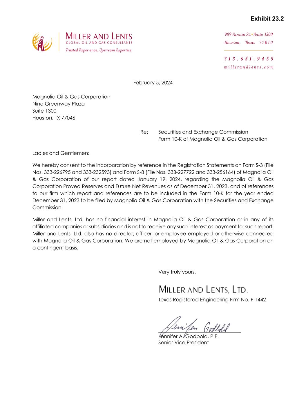 February 5, 2024 Magnolia Oil & Gas Corporation Nine Greenway Plaza Suite 1300 Houston, TX 77046 Re: Securities and Exchange Commission Form 10-K of Magnolia Oil & Gas Corporation Ladies and Gentlemen: We hereby consent to the incorporation by reference in the Registration Statements on Form S-3 (File Nos. 333-226795 and 333-232593) and Form S-8 (File Nos. 333-227722 and 333-256164) of Magnolia Oil & Gas Corporation of our report dated January 19, 2024, regarding the Magnolia Oil & Gas Corporation Proved Reserves and Future Net Revenues as of December 31, 2023, and of references to our firm which report and references are to be included in the Form 10-K for the year ended December 31, 2023 to be filed by Magnolia Oil & Gas Corporation with the Securities and Exchange Commission. Miller and Lents, Ltd. has no financial interest in Magnolia Oil & Gas Corporation or in any of its affiliated companies or subsidiaries and is not to receive any such interest as payment for such report. Miller and Lents, Ltd. also has no director, officer, or employee employed or otherwise connected with Magnolia Oil & Gas Corporation. We are not employed by Magnolia Oil & Gas Corporation on a contingent basis. Very truly yours, Texas Registered Engineering Firm No. F-1442 _________________________________ Jennifer A. Godbold, P.E. Senior Vice President