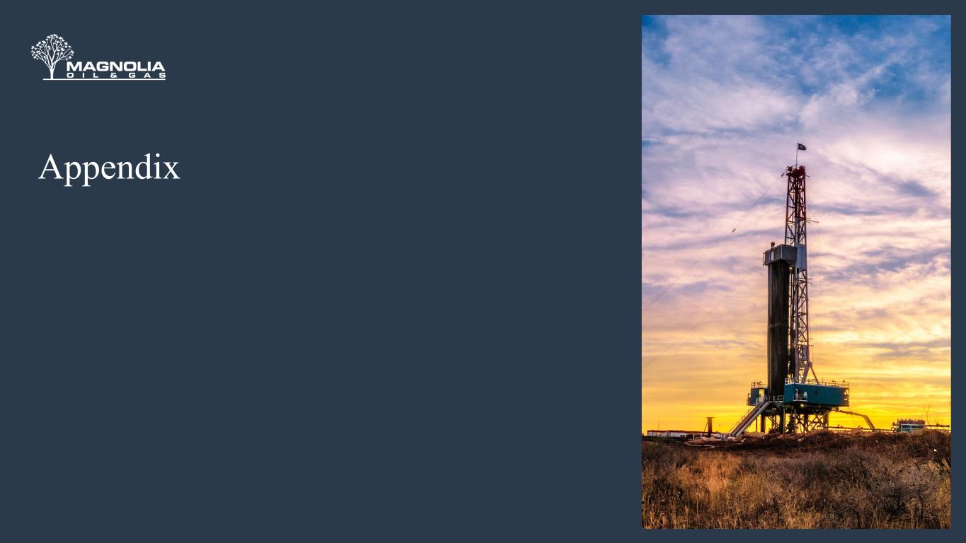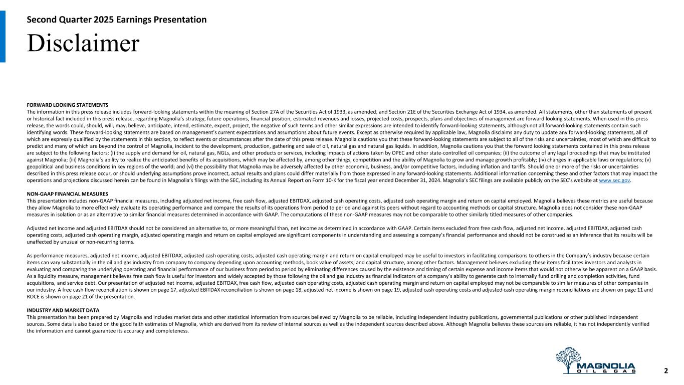 Disclaimer FORWARD LOOKING STATEMENTS The information in this press release includes forward-looking statements within the meaning of Section 27A of the Securities Act of 1933, as amended, and Section 21E of the Securities Exchange Act of 1934, as amended. All statements, other than statements of present or historical fact included in this press release, regarding Magnolia’s strategy, future operations, financial position, estimated revenues and losses, projected costs, prospects, plans and objectives of management are forward looking statements. When used in this press release, the words could, should, will, may, believe, anticipate, intend, estimate, expect, project, the negative of such terms and other similar expressions are intended to identify forward-looking statements, although not all forward-looking statements contain such identifying words. These forward-looking statements are based on management’s current expectations and assumptions about future events. Except as otherwise required by applicable law, Magnolia disclaims any duty to update any forward-looking statements, all of which are expressly qualified by the statements in this section, to reflect events or circumstances after the date of this press release. Magnolia cautions you that these forward-looking statements are subject to all of the risks and uncertainties, most of which are difficult to predict and many of which are beyond the control of Magnolia, incident to the development, production, gathering and sale of oil, natural gas and natural gas liquids. In addition, Magnolia cautions you that the forward looking statements contained in this press release are subject to the following factors: (i) the supply and demand for oil, natural gas, NGLs, and other products or services, including impacts of actions taken by OPEC and other state-controlled oil companies; (ii) the outcome of any legal proceedings that may be instituted against Magnolia; (iii) Magnolia’s ability to realize the anticipated benefits of its acquisitions, which may be affected by, among other things, competition and the ability of Magnolia to grow and manage growth profitably; (iv) changes in applicable laws or regulations; (v) geopolitical and business conditions in key regions of the world; and (vi) the possibility that Magnolia may be adversely affected by other economic, business, and/or competitive factors, including inflation and tariffs. Should one or more of the risks or uncertainties described in this press release occur, or should underlying assumptions prove incorrect, actual results and plans could differ materially from those expressed in any forward-looking statements. Additional information concerning these and other factors that may impact the operations and projections discussed herein can be found in Magnolia’s filings with the SEC, including its Annual Report on Form 10-K for the fiscal year ended December 31, 2024. Magnolia’s SEC filings are available publicly on the SEC’s website at www.sec.gov. NON-GAAP FINANCIAL MEASURES This presentation includes non-GAAP financial measures, including adjusted net income, free cash flow, adjusted EBITDAX, adjusted cash operating costs, adjusted cash operating margin and return on capital employed. Magnolia believes these metrics are useful because they allow Magnolia to more effectively evaluate its operating performance and compare the results of its operations from period to period and against its peers without regard to accounting methods or capital structure. Magnolia does not consider these non-GAAP measures in isolation or as an alternative to similar financial measures determined in accordance with GAAP. The computations of these non-GAAP measures may not be comparable to other similarly titled measures of other companies. Adjusted net income and adjusted EBITDAX should not be considered an alternative to, or more meaningful than, net income as determined in accordance with GAAP. Certain items excluded from free cash flow, adjusted net income, adjusted EBITDAX, adjusted cash operating costs, adjusted cash operating margin, adjusted operating margin and return on capital employed are significant components in understanding and assessing a company’s financial performance and should not be construed as an inference that its results will be unaffected by unusual or non-recurring terms. As performance measures, adjusted net income, adjusted EBITDAX, adjusted cash operating costs, adjusted cash operating margin and return on capital employed may be useful to investors in facilitating comparisons to others in the Company’s industry because certain items can vary substantially in the oil and gas industry from company to company depending upon accounting methods, book value of assets, and capital structure, among other factors. Management believes excluding these items facilitates investors and analysts in evaluating and comparing the underlying operating and financial performance of our business from period to period by eliminating differences caused by the existence and timing of certain expense and income items that would not otherwise be apparent on a GAAP basis. As a liquidity measure, management believes free cash flow is useful for investors and widely accepted by those following the oil and gas industry as financial indicators of a company’s ability to generate cash to internally fund drilling and completion activities, fund acquisitions, and service debt. Our presentation of adjusted net income, adjusted EBITDAX, free cash flow, adjusted cash operating costs, adjusted cash operating margin and return on capital employed may not be comparable to similar measures of other companies in our industry. A free cash flow reconciliation is shown on page 17, adjusted EBITDAX reconciliation is shown on page 18, adjusted net income is shown on page 19, adjusted cash operating costs and adjusted cash operating margin reconciliations are shown on page 11 and ROCE is shown on page 