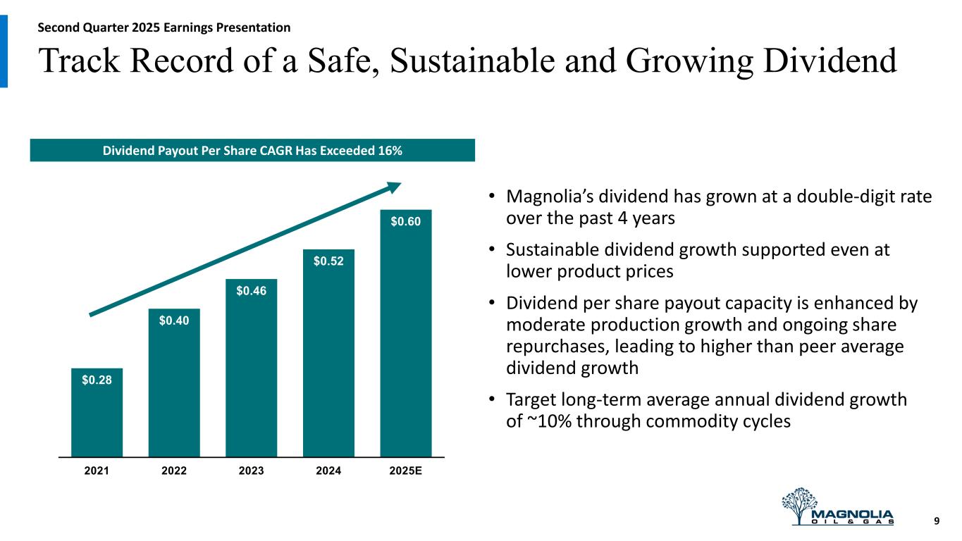 (1) Class A share reduction includes 3.6 million non-compete shares that were paid in lieu of stock in 2021. Includes both Class A and Class B share repurchases. History of Significant & Consistent Share Repurchases 7.0 4.5 25.3 15.5 9.6 11.0 4.4 (77.2) 2019 2020 2021 2022 2023 2024 2025 YTD Total 0 10 20 30 40 50 60 70 80 Second Quarter 2025 Earnings Presentation 8 Magnolia has reduced its diluted share count by approximately 25% Magnolia’s Consistent Share Repurchases (1) (million shares repurchased)