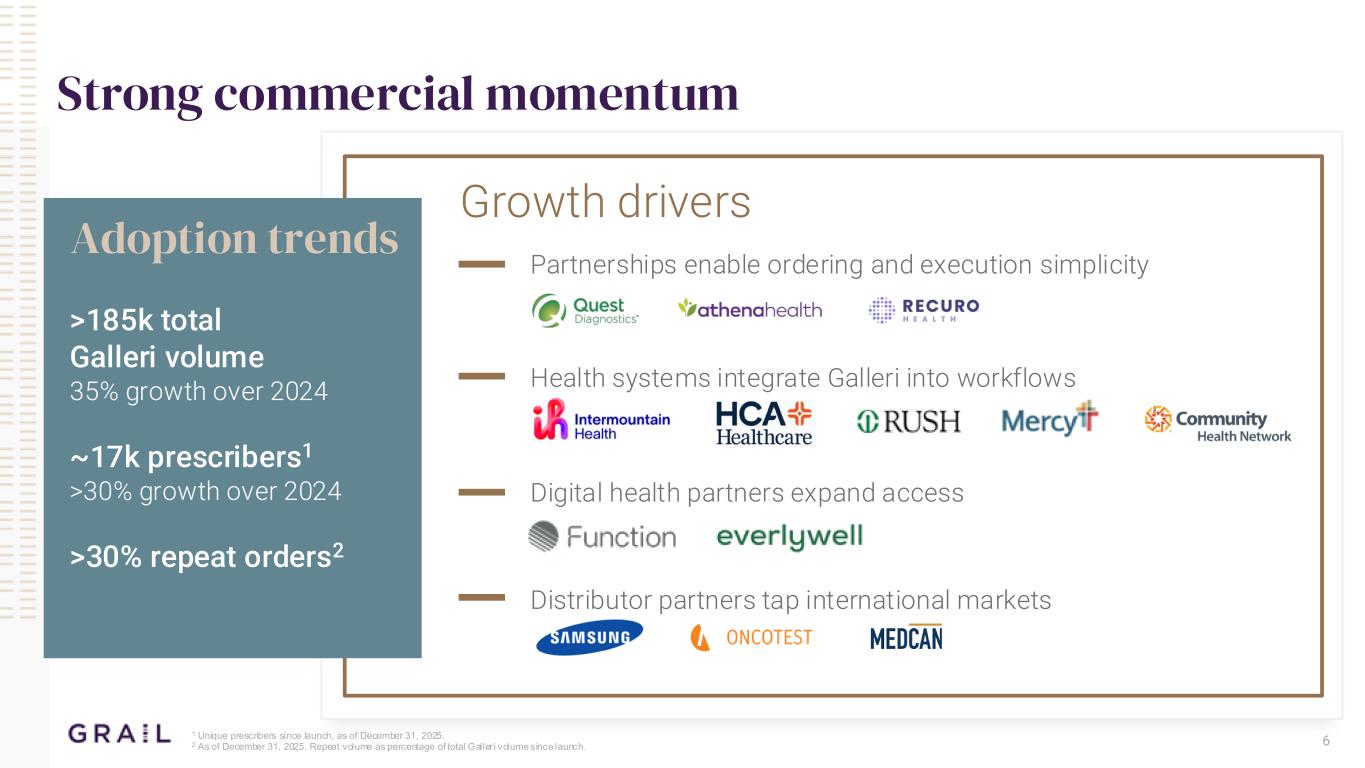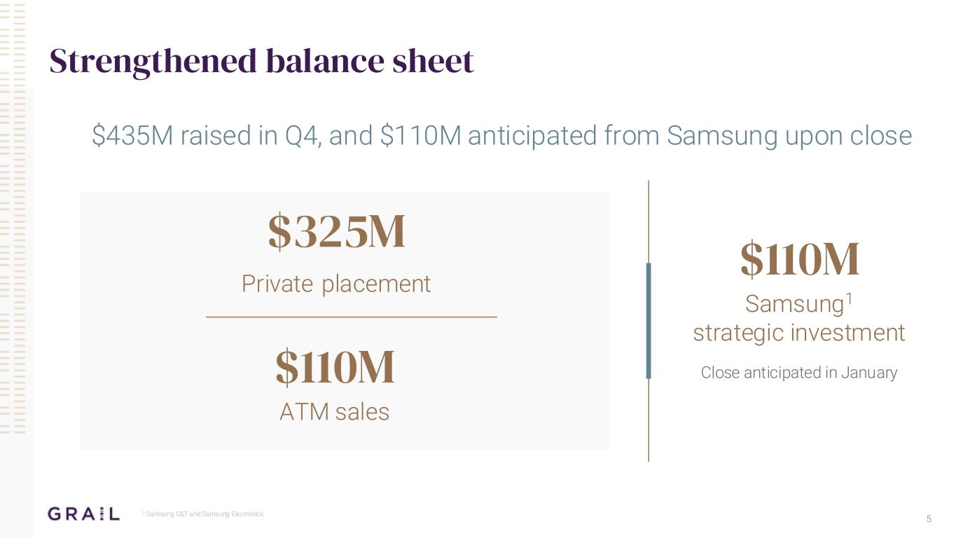 >800k In market with Galleri MCED test >4 years 4 GRAIL at a glance Upcoming Complete PMA submission Present full datasets from 140k randomized controlled NHS-Galleri trial and 35k PATHFINDER 2 study Continue to expand US commercial market Advance Galleri in international markets MCED: multi-cancer early detection. PMA: Pre-market approval. 1 Unrestricted cash, cash equivalents, and short-term marketable securities. Preliminary unaudited financial informat ion. These amounts are preliminary, have not been subject to review by the Company’s independent registered public accounting firm, and are subject to change pending completion of the Company’s audited f inancial statements for the quarter and year ended December 31, 2025. Additional information and disclosures would be required for a more complete understanding of the Company’s financial position and results of operat ions as of and for the quarter and year ended December 31, 2025 Galleri is the only MCED test with demonstrated performance in the intended use population Commercial Galleri® tests sold to-date >475k 2025 revenue $147-148M Clinical and commercial tests completed to-date Test capacity at RTP site 1M+ Cash position1 as of year end 2025 $904M