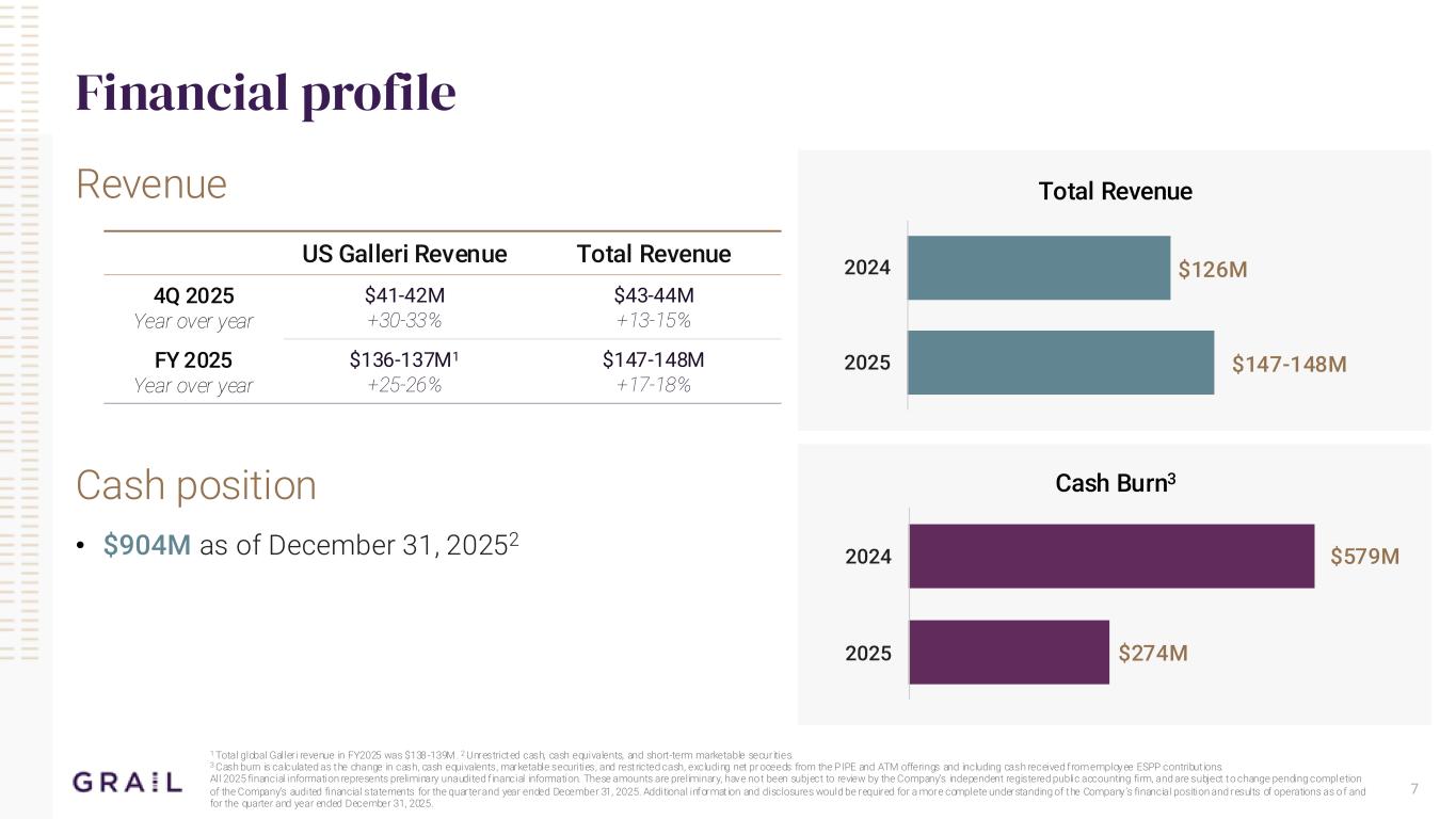 6 Strong commercial momentum >185k total Galleri volume 35% growth over 2024 ~17k prescribers1 >30% growth over 2024 >30% repeat orders2 Partnerships enable ordering and execution simplicity Distributor partners tap international markets Growth drivers Health systems integrate Galleri into workflows Digital health partners expand access Adoption trends 1 Unique prescribers since launch, as of December 31, 2025. 2 As of December 31, 2025. Repeat volume as percentage of total Galler i volume since launch.