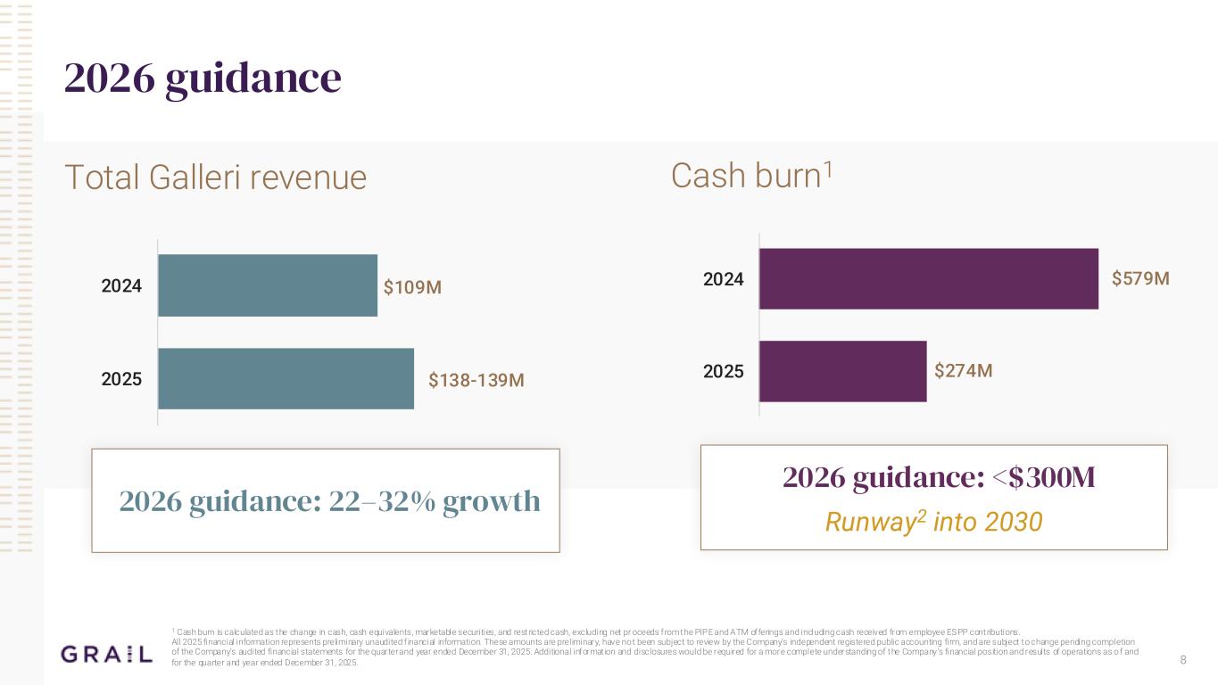 7 Financial profile Revenue Cash position • $904M as of December 31, 20252 1 Total global Galleri revenue in FY2025 was $138-139M . 2 Unrestricted cash, cash equivalents, and short-term marketable securities. 3 Cash burn is calculated as the change in cash, cash equivalents, marketable securities, and restricted cash, excluding net pr oceeds from the PIPE and ATM offerings and including cash received from employee ESPP contribut ions. All 2025 financial information represents preliminary unaudited f inancial information. These amounts are preliminary, have not been subject to review by the Company’s independent registered public accounting firm, and are subject to change pending completion of the Company’s audited financial statements for the quarter and year ended December 31, 2025. Additional informat ion and disclosures would be required for a more complete understanding of the Company’s financial position and results of operations as o f and for the quarter and year ended December 31, 2025. US Galleri Revenue Total Revenue 4Q 2025 Year over year $41-42M +30-33% $43-44M +13-15% FY 2025 Year over year $136-137M1 +25-26% $147-148M +17-18% Total Revenue Cash Burn3 $147-148M $126M 2025 2024 $274M $579M 2025 2024