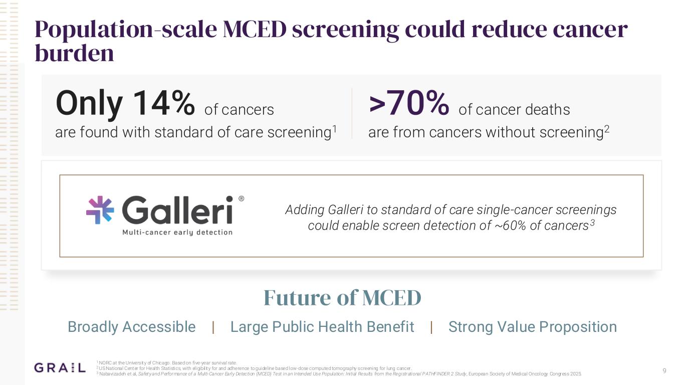 8 2026 guidance Total Galleri revenue Cash burn1 1 Cash burn is calculated as the change in cash, cash equivalents, marketable securities, and restricted cash, excluding net pr oceeds from the PIPE and ATM offerings and including cash received from employee ESPP contributions. All 2025 financial information represents preliminary unaudited f inancial information. These amounts are preliminary, have not been subject to review by the Company’s independent registered public accounting firm, and are subject to change pending completion of the Company’s audited financial statements for the quarter and year ended December 31, 2025. Additional informat ion and disclosures would be required for a more complete understanding of the Company’s financial position and results of operations as o f and for the quarter and year ended December 31, 2025. $138-139M $109M 2025 2024 $274M $579M 2025 2024 2026 guidance: 22–32% growth 2026 guidance: <$300M Runway2 into 2030