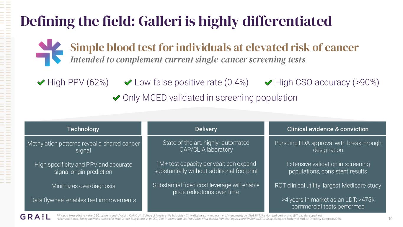 9 Population-scale MCED screening could reduce cancer burden Only 14% of cancers are found with standard of care screening1 Image of early stage cancers detected Adding Galleri to standard of care single-cancer screenings could enable screen detection of ~60% of cancers3 Future of MCED Broadly Accessible | Large Public Health Benefit | Strong Value Proposition >70% of cancer deaths are from cancers without screening2 1 NORC at the University of Chicago. Based on five-year survival rate. 2 US National Center for Health Statistics, with eligibility for and adherence to guideline based low-dose computed tomography screening for lung cancer. 3 Nabavizadeh et al, Safety and Performance of a Multi-Cancer Early Detection (MCED) Test in an Intended Use Population: Initial Results from the Registrational PATHFINDER 2 Study , European Society of Medical Oncology Congress 2025.