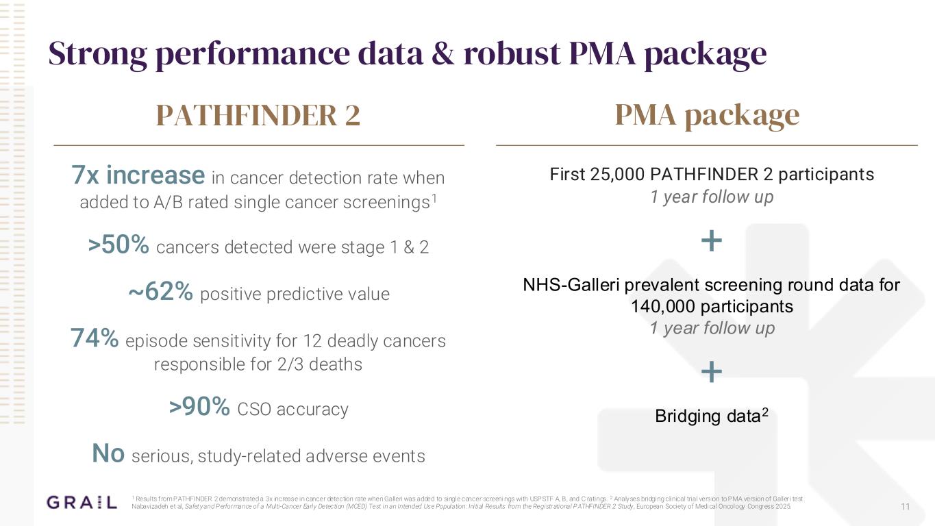 10 Defining the field: Galleri is highly differentiated Simple blood test for individuals at elevated risk of cancer Intended to complement current single-cancer screening tests High PPV (62%) Low false positive rate (0.4%) High CSO accuracy (>90%) Only MCED validated in screening population Methylation patterns reveal a shared cancer signal High specificity and PPV and accurate signal origin prediction Minimizes overdiagnosis Data flywheel enables test improvements Technology State of the art, highly- automated CAP/CLIA laboratory 1M+ test capacity per year; can expand substantially without additional footprint Substantial fixed cost leverage will enable price reductions over time Delivery Pursuing FDA approval with breakthrough designation Extensive validation in screening populations, consistent results RCT clinical utility, largest Medicare study >4 years in market as an LDT; >475k commercial tests performed Clinical evidence & conviction PPV: positive predictive value. CSO: cancer signal of origin. CAP/CLIA: College of American Pathologists / Clinical Laboratory Improvement Amendments certif ied. RCT: Randomized control trial. LDT: Lab developed test. Nabavizadeh et al, Safety and Performance of a Multi-Cancer Early Detection (MCED) Test in an Intended Use Population: Initial Results from the Registrational PATHFINDER 2 Study , European Society of Medical Oncology Congress 2025.