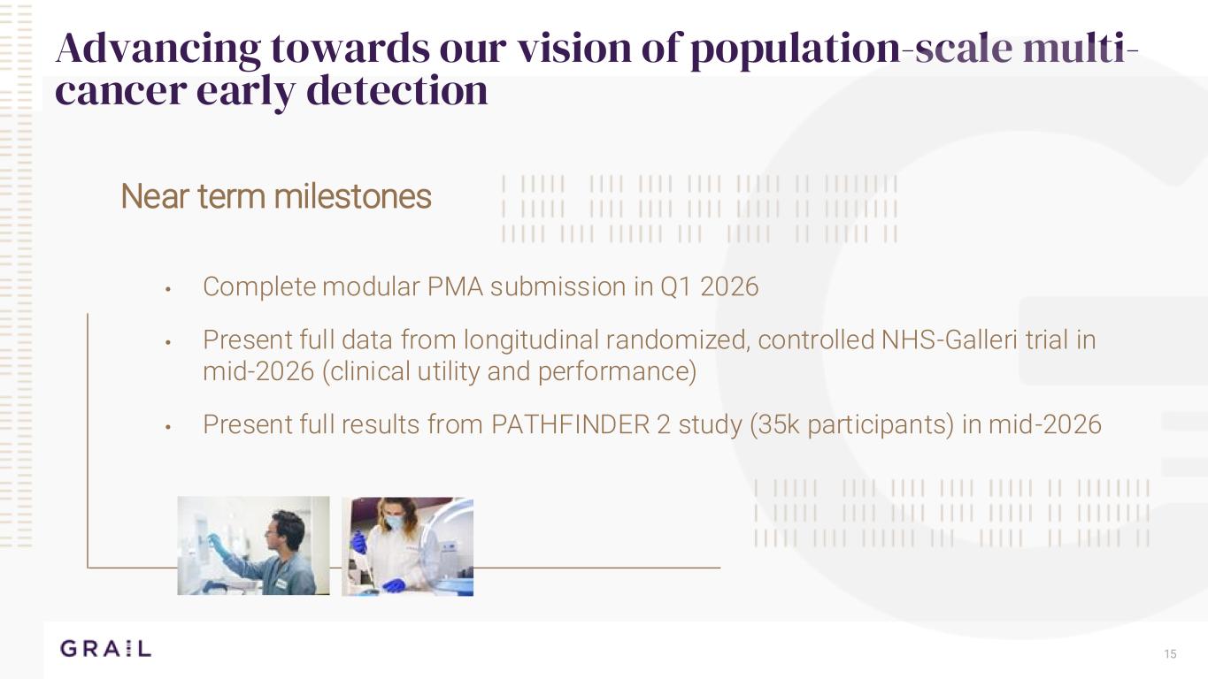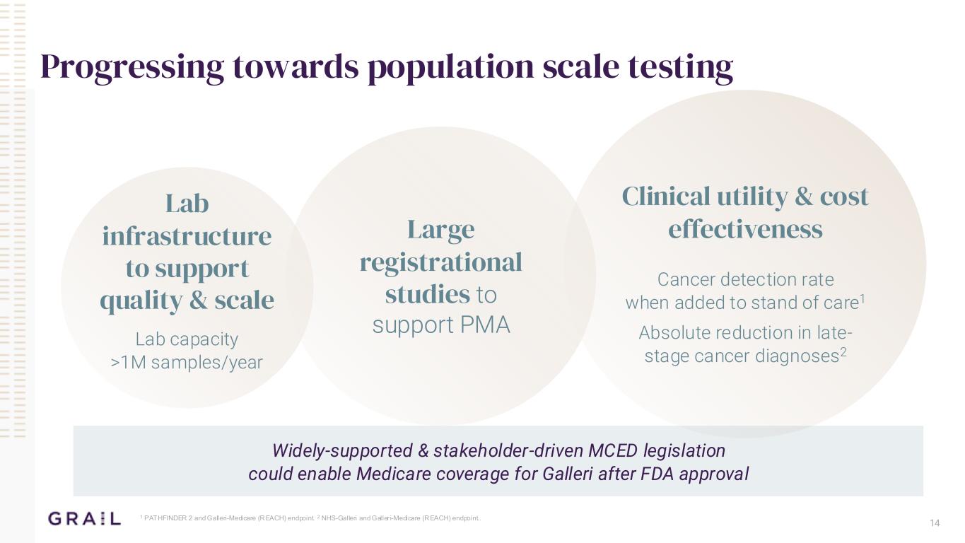 Clinical utility & cost effectivenessLarge registrational studies to support PMA 14 Progressing towards population scale testing 1 PATHFINDER 2 and Galleri-Medicare (REACH) endpoint. 2 NHS-Galleri and Galler i-Medicare (REACH) endpoint.. Lab infrastructure to support quality & scale Lab capacity >1M samples/year Cancer detection rate when added to stand of care1 Absolute reduction in late- stage cancer diagnoses2 Widely-supported & stakeholder-driven MCED legislation could enable Medicare coverage for Galleri after FDA approval