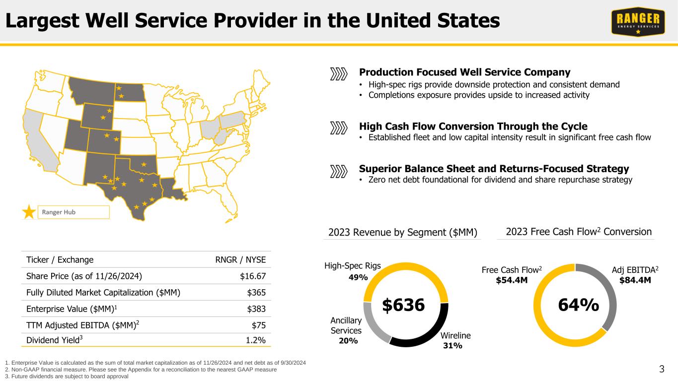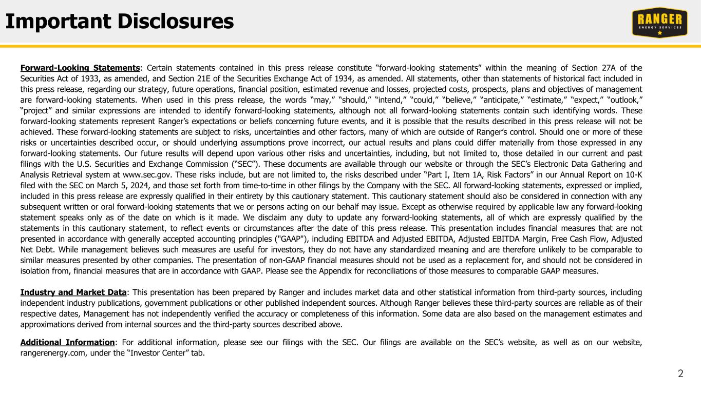 Forward-Looking Statements: Certain statements contained in this press release constitute “forward-looking statements” within the meaning of Section 27A of the Securities Act of 1933, as amended, and Section 21E of the Securities Exchange Act of 1934, as amended. All statements, other than statements of historical fact included in this press release, regarding our strategy, future operations, financial position, estimated revenue and losses, projected costs, prospects, plans and objectives of management are forward-looking statements. When used in this press release, the words “may,” “should,” “intend,” “could,” “believe,” “anticipate,” “estimate,” “expect,” “outlook,” “project” and similar expressions are intended to identify forward-looking statements, although not all forward-looking statements contain such identifying words. These forward-looking statements represent Ranger’s expectations or beliefs concerning future events, and it is possible that the results described in this press release will not be achieved. These forward-looking statements are subject to risks, uncertainties and other factors, many of which are outside of Ranger’s control. Should one or more of these risks or uncertainties described occur, or should underlying assumptions prove incorrect, our actual results and plans could differ materially from those expressed in any forward-looking statements. Our future results will depend upon various other risks and uncertainties, including, but not limited to, those detailed in our current and past filings with the U.S. Securities and Exchange Commission (“SEC”). These documents are available through our website or through the SEC’s Electronic Data Gathering and Analysis Retrieval system at www.sec.gov. These risks include, but are not limited to, the risks described under “Part I, Item 1A, Risk Factors” in our Annual Report on 10-K filed with the SEC on March 5, 2024, and those set forth from time-to-time in other filings by the Company with the SEC. All forward-looking statements, expressed or implied, included in this press release are expressly qualified in their entirety by this cautionary statement. This cautionary statement should also be considered in connection with any subsequent written or oral forward-looking statements that we or persons acting on our behalf may issue. Except as otherwise required by applicable law any forward-looking statement speaks only as of the date on which is it made. We disclaim any duty to update any forward-looking statements, all of which are expressly qualified by the statements in this cautionary statement, to reflect events or circumstances after the date of this press release. This presentation includes financial measures that are not presented in accordance with generally accepted accounting principles ("GAAP"), including EBITDA and Adjusted EBITDA, Adjusted EBITDA Margin, Free Cash Flow, Adjusted Net Debt. While management believes such measures are useful for investors, they do not have any standardized meaning and are therefore unlikely to be comparable to similar measures presented by other companies. The presentation of non-GAAP financial measures should not be used as a replacement for, and should not be considered in isolation from, financial measures that are in accordance with GAAP. Please see the Appendix for reconciliations of those measures to comparable GAAP measures. Industry and Market Data: This presentation has been prepared by Ranger and includes market data and other statistical information from third-party sources, including independent industry publications, government publications or other published independent sources. Although Ranger believes these third-party sources are reliable as of their respective dates, Management has not independently verified the accuracy or completeness of this information. Some data are also based on the management estimates and approximations derived from internal sources and the third-party sources described above. Additional Information: For additional information, please see our filings with the SEC. Our filings are available on the SEC’s website, as well as on our website, rangerenergy.com, under the “Investor Center” tab. 2 Important Disclosures
