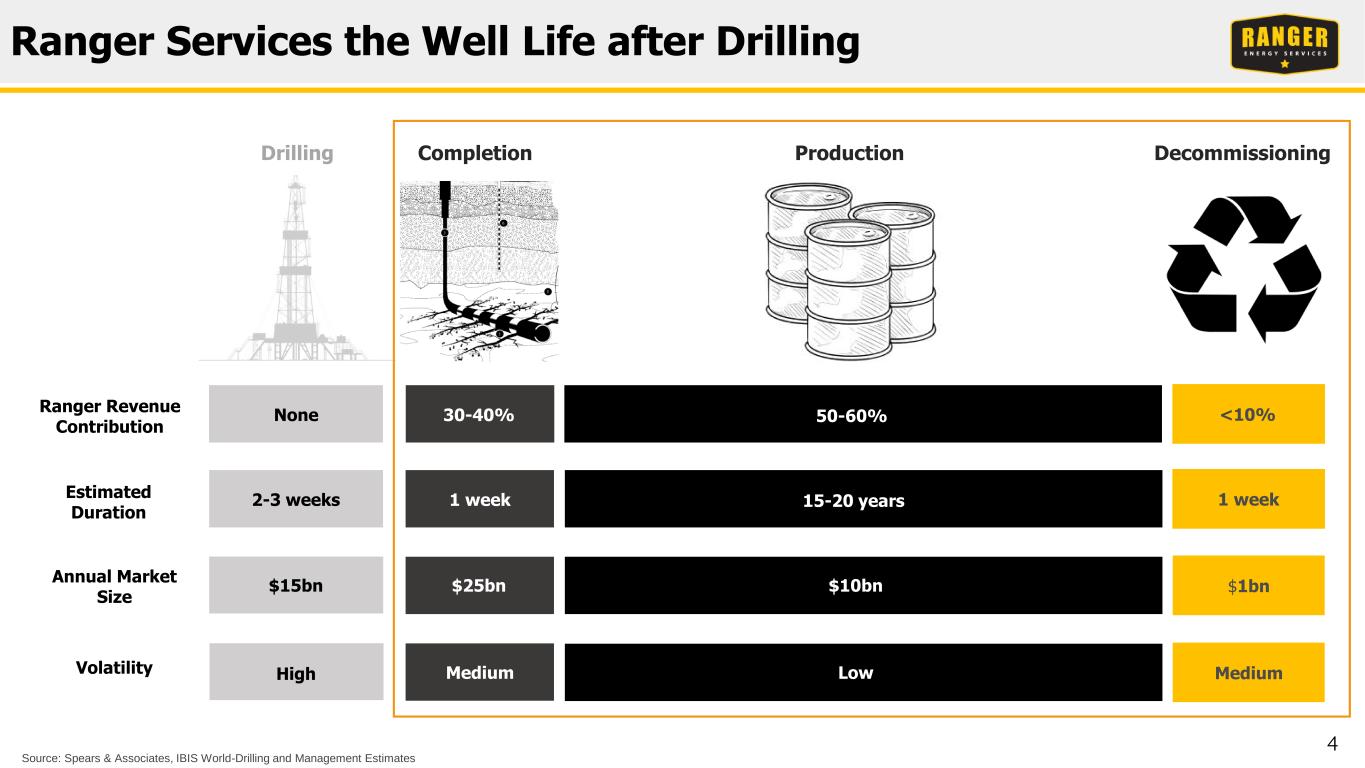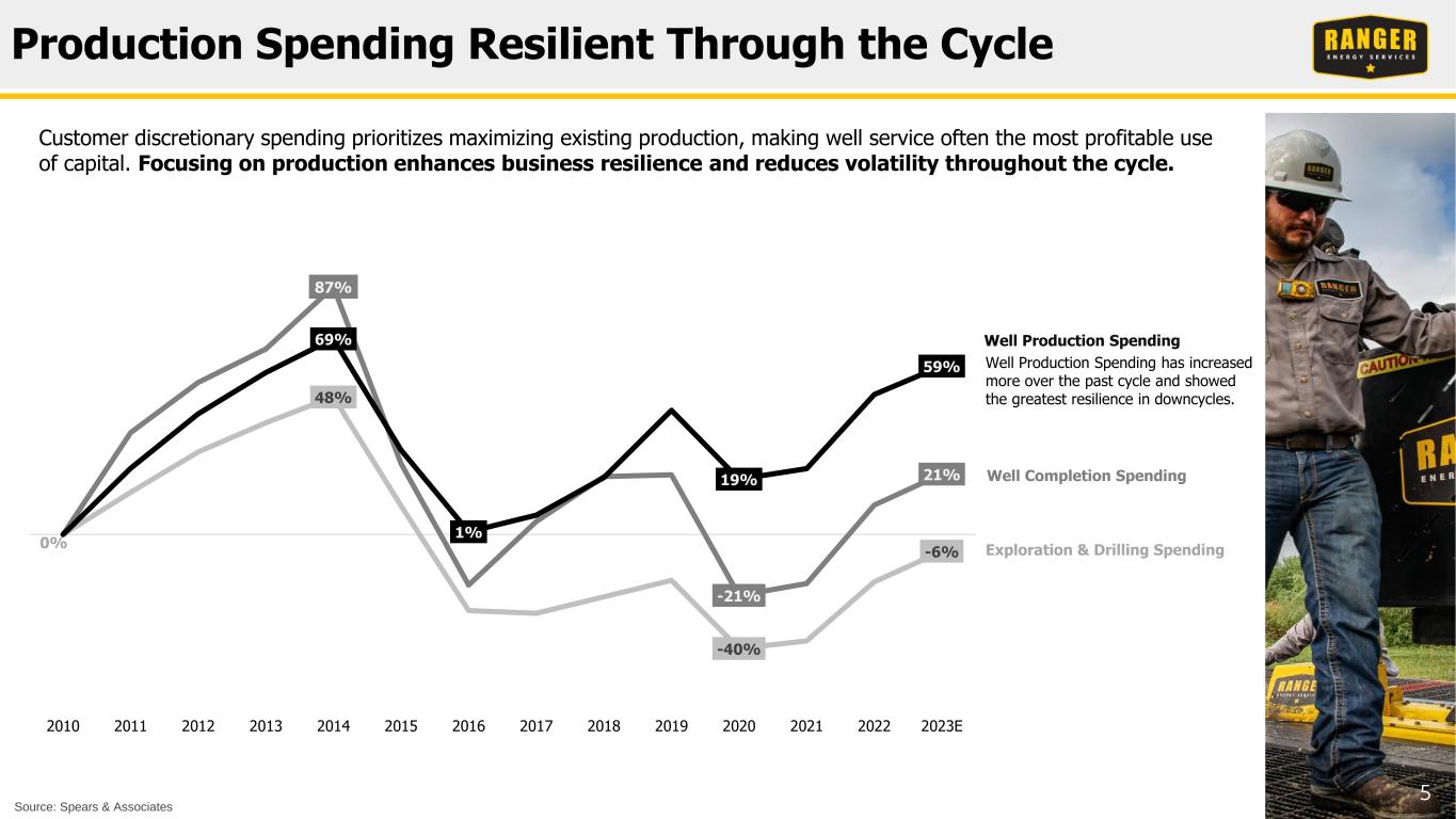 $1bn Medium Source: Spears & Associates, IBIS World-Drilling and Management Estimates Completion Production 30-40% 50-60% <10% Drilling Estimated Duration Volatility None High Medium Annual Market Size Ranger Revenue Contribution $15bn $25bn $10bn Low Decommissioning 1 week 15-20 years 1 week2-3 weeks 4 Ranger Services the Well Life after Drilling