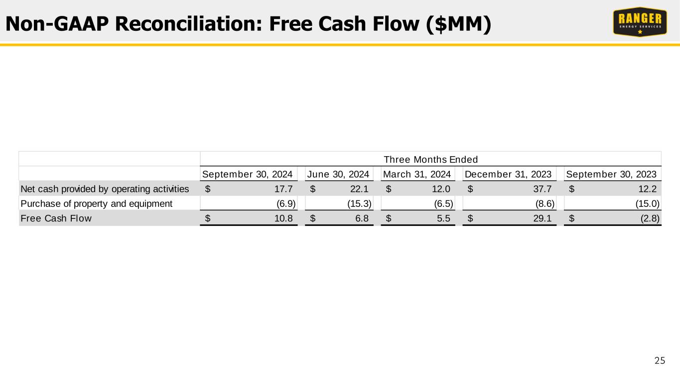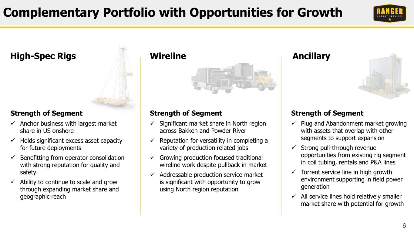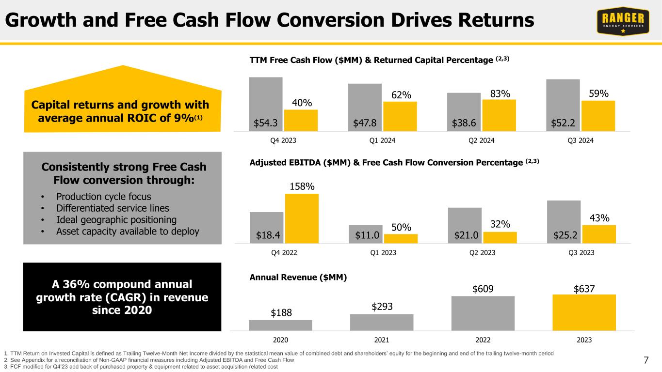 49% 31% 20% High-Spec Rigs Ancillary Services Wireline Largest Well Service Provider in the United States $636 1. Enterprise Value is calculated as the sum of total market capitalization as of 11/26/2024 and net debt as of 9/30/2024 2. Non-GAAP financial measure. Please see the Appendix for a reconciliation to the nearest GAAP measure 3. Future dividends are subject to board approval Ticker / Exchange RNGR / NYSE Share Price (as of 11/26/2024) $16.67 Fully Diluted Market Capitalization ($MM) $365 Enterprise Value ($MM)1 $383 TTM Adjusted EBITDA ($MM)2 $75 Dividend Yield3 1.2% 64% Adj EBITDA2 $84.4M Free Cash Flow2 $54.4M 2023 Revenue by Segment ($MM) 2023 Free Cash Flow2 Conversion Production Focused Well Service Company • High-spec rigs provide downside protection and consistent demand • Completions exposure provides upside to increased activity High Cash Flow Conversion Through the Cycle • Established fleet and low capital intensity result in significant free cash flow Superior Balance Sheet and Returns-Focused Strategy • Zero net debt foundational for dividend and share repurchase strategy 3