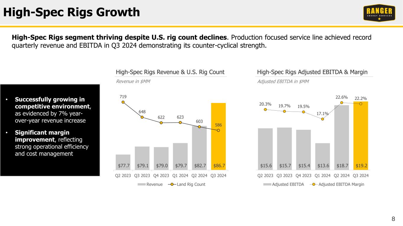 $188 $293 $609 $637 - 200 400 600 800 2020 2021 2022 2023 7 Annual Revenue ($MM) Consistently strong Free Cash Flow conversion through: • Production cycle focus • Differentiated service lines • Ideal geographic positioning • Asset capacity available to deploy 1. TTM Return on Invested Capital is defined as Trailing Twelve-Month Net Income divided by the statistical mean value of combined debt and shareholders’ equity for the beginning and end of the trailing twelve-month period 2. See Appendix for a reconciliation of Non-GAAP financial measures including Adjusted EBITDA and Free Cash Flow 3. FCF modified for Q4’23 add back of purchased property & equipment related to asset acquisition related cost A 36% compound annual growth rate (CAGR) in revenue since 2020 Capital returns and growth with average annual ROIC of 9%(1) Adjusted EBITDA ($MM) & Free Cash Flow Conversion Percentage (2,3) Growth and Free Cash Flow Conversion Drives Returns $54.3 $47.8 $38.6 $52.2 Q4 2023 Q1 2024 Q2 2024 Q3 2024 TTM Free Cash Flow ($MM) & Returned Capital Percentage (2,3) 40% 62% 83% 59% $18.4 $11.0 $21.0 $25.2 Q4 2022 Q1 2023 Q2 2023 Q3 2023 158% 50% 32% 43%