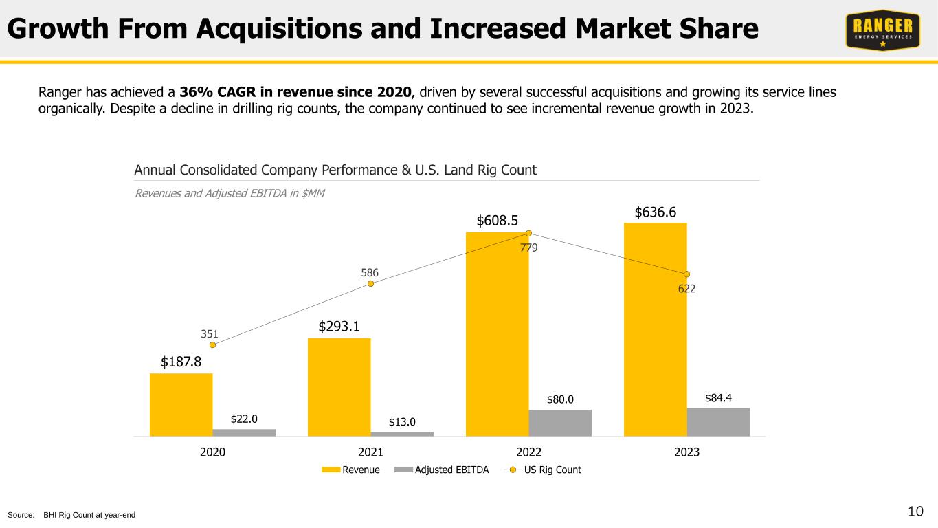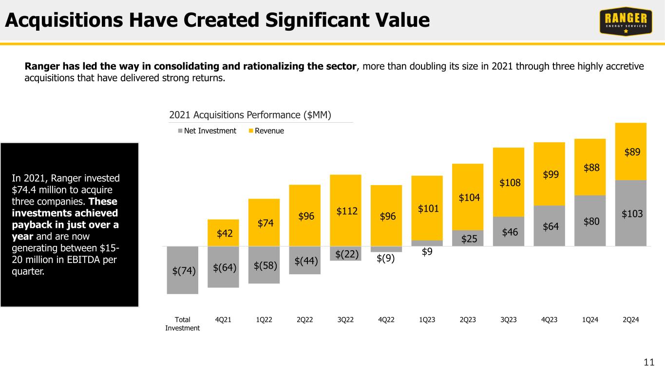Source: BHI Rig Count at year-end Ranger has achieved a 36% CAGR in revenue since 2020, driven by several successful acquisitions and growing its service lines organically. Despite a decline in drilling rig counts, the company continued to see incremental revenue growth in 2023. 10 $187.8 $293.1 $608.5 $636.6 $22.0 $13.0 $80.0 $84.4 351 586 779 622 2020 2021 2022 2023 Revenue Adjusted EBITDA US Rig Count Growth From Acquisitions and Increased Market Share Annual Consolidated Company Performance & U.S. Land Rig Count Revenues and Adjusted EBITDA in $MM