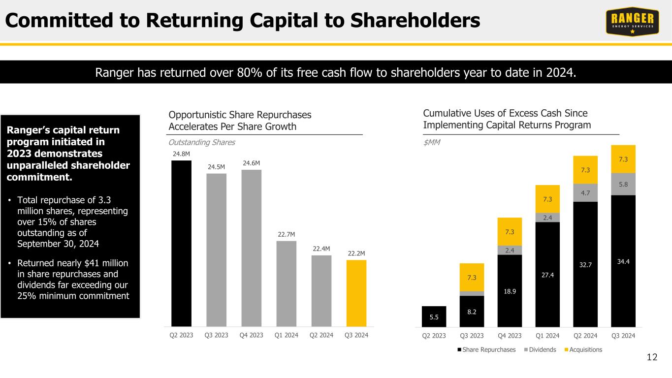 Ranger has led the way in consolidating and rationalizing the sector, more than doubling its size in 2021 through three highly accretive acquisitions that have delivered strong returns. 11 In 2021, Ranger invested $74.4 million to acquire three companies. These investments achieved payback in just over a year and are now generating between $15- 20 million in EBITDA per quarter. Acquisitions Have Created Significant Value 2021 Acquisitions Performance ($MM) $(74) $(64) $(58) $(44) $(22) $(9) $9 $25 $46 $64 $80 $103 $42 $74 $96 $112 $96 $101 $104 $108 $99 $88 $89 Total Investment 4Q21 1Q22 2Q22 3Q22 4Q22 1Q23 2Q23 3Q23 4Q23 1Q24 2Q24 Net Investment Revenue