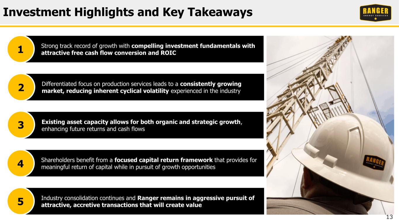 12 Ranger has returned over 80% of its free cash flow to shareholders year to date in 2024. Committed to Returning Capital to Shareholders Cumulative Uses of Excess Cash Since Implementing Capital Returns Program Opportunistic Share Repurchases Accelerates Per Share Growth Outstanding Shares $MM Ranger’s capital return program initiated in 2023 demonstrates unparalleled shareholder commitment. • Total repurchase of 3.3 million shares, representing over 15% of shares outstanding as of September 30, 2024 • Returned nearly $41 million in share repurchases and dividends far exceeding our 25% minimum commitment 24.8M 24.5M 24.6M 22.7M 22.4M 22.2M Q2 2023 Q3 2023 Q4 2023 Q1 2024 Q2 2024 Q3 2024 5.5 8.2 18.9 27.4 32.7 34.4 2.4 2.4 4.7 5.8 7.3 7.3 7.3 7.3 7.3 Q2 2023 Q3 2023 Q4 2023 Q1 2024 Q2 2024 Q3 2024 Share Repurchases Dividends Acquisitions