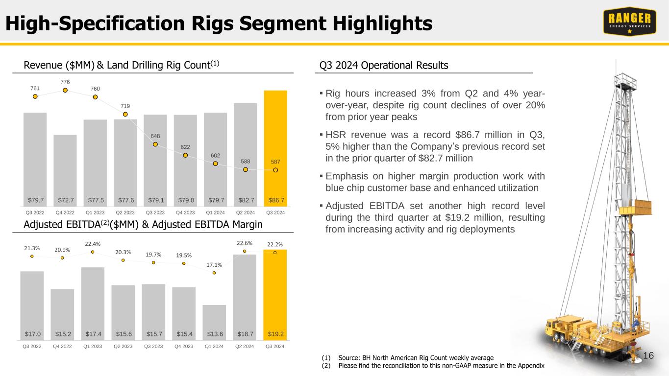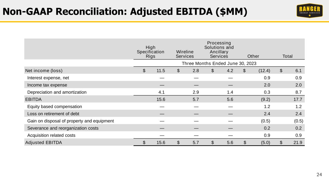 23 High Specification Rigs Wireline Services Processing Solutions and Ancillary Services Other Total Three Months Ended September 30, 2023 Net income (loss) $ 10.6 $ 4.3 $ 4.5 $ (10.0) $ 9.4 Interest expense, net — — — 0.7 0.7 Income tax expense — — — 1.6 1.6 Depreciation and amortization 5.1 3.1 2.0 0.4 10.6 EBITDA 15.7 7.4 6.5 (7.3) 22.3 Impairment of fixed assets — — — 0.4 0.4 Equity based compensation — — — 1.3 1.3 Gain on disposal of property and equipment — — — (0.1) (0.1) Acquisition related costs — — — 0.1 0.1 Adjusted EBITDA $ 15.7 $ 7.4 $ 6.5 $ (5.6) $ 24.0 Non-GAAP Reconciliation: Adjusted EBITDA ($MM)