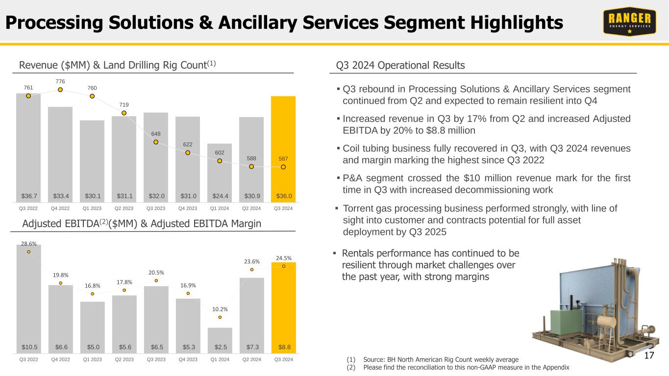 16 Revenue ($MM) & Land Drilling Rig Count(1) Adjusted EBITDA(2)($MM) & Adjusted EBITDA Margin (1) Source: BH North American Rig Count weekly average (2) Please find the reconciliation to this non-GAAP measure in the Appendix Q3 2024 Operational Results ▪ Rig hours increased 3% from Q2 and 4% year- over-year, despite rig count declines of over 20% from prior year peaks ▪ HSR revenue was a record $86.7 million in Q3, 5% higher than the Company’s previous record set in the prior quarter of $82.7 million ▪ Emphasis on higher margin production work with blue chip customer base and enhanced utilization ▪ Adjusted EBITDA set another high record level during the third quarter at $19.2 million, resulting from increasing activity and rig deployments High-Specification Rigs Segment Highlights $79.7 $72.7 $77.5 $77.6 $79.1 $79.0 $79.7 $82.7 $86.7 761 776 760 719 648 622 602 588 587 Q3 2022 Q4 2022 Q1 2023 Q2 2023 Q3 2023 Q4 2023 Q1 2024 Q2 2024 Q3 2024 $17.0 $15.2 $17.4 $15.6 $15.7 $15.4 $13.6 $18.7 $19.2 21.3% 20.9% 22.4% 20.3% 19.7% 19.5% 17.1% 22.6% 22.2% Q3 2022 Q4 2022 Q1 2023 Q2 2023 Q3 2023 Q4 2023 Q1 2024 Q2 2024 Q3 2024