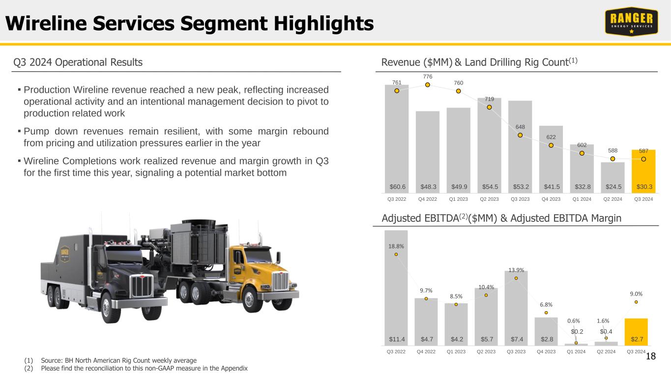 17 Revenue ($MM) & Land Drilling Rig Count(1) Adjusted EBITDA(2)($MM) & Adjusted EBITDA Margin (1) Source: BH North American Rig Count weekly average (2) Please find the reconciliation to this non-GAAP measure in the Appendix ▪ Q3 rebound in Processing Solutions & Ancillary Services segment continued from Q2 and expected to remain resilient into Q4 ▪ Increased revenue in Q3 by 17% from Q2 and increased Adjusted EBITDA by 20% to $8.8 million ▪ Coil tubing business fully recovered in Q3, with Q3 2024 revenues and margin marking the highest since Q3 2022 ▪ P&A segment crossed the $10 million revenue mark for the first time in Q3 with increased decommissioning work Q3 2024 Operational Results ▪ Torrent gas processing business performed strongly, with line of sight into customer and contracts potential for full asset deployment by Q3 2025 ▪ Rentals performance has continued to be resilient through market challenges over the past year, with strong margins Processing Solutions & Ancillary Services Segment Highlights $36.7 $33.4 $30.1 $31.1 $32.0 $31.0 $24.4 $30.9 $36.0 761 776 760 719 648 622 602 588 587 Q3 2022 Q4 2022 Q1 2023 Q2 2023 Q3 2023 Q4 2023 Q1 2024 Q2 2024 Q3 2024 $10.5 $6.6 $5.0 $5.6 $6.5 $5.3 $2.5 $7.3 $8.8 28.6% 19.8% 16.8% 17.8% 20.5% 16.9% 10.2% 23.6% 24.5% Q3 2022 Q4 2022 Q1 2023 Q2 2023 Q3 2023 Q4 2023 Q1 2024 Q2 2024 Q3 2024