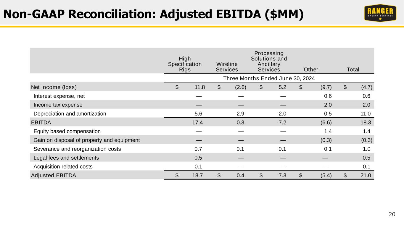 19 Non-GAAP Reconciliation: Adjusted EBITDA ($MM) High Specification Rigs Wireline Services Processing Solutions and Ancillary Services Other Total Three Months Ended September 30, 2024 Net income (loss) $ 13.8 $ — $ 6.6 $ (11.7) $ 8.7 Interest expense, net — — — 0.7 0.7 Income tax expense — — — 3.5 3.4 Depreciation and amortization 5.7 2.7 2.2 0.5 11.1 EBITDA 19.5 2.7 8.8 (7.0) 24.0 Equity based compensation — — — 1.4 1.4 Gain on disposal of property and equipment — — — (0.1) (0.1) Legal fees and settlements (0.3) — — 0.1 (0.2) Adjusted EBITDA $ 19.2 $ 2.7 $ 8.8 $ (5.6) $ 25.1