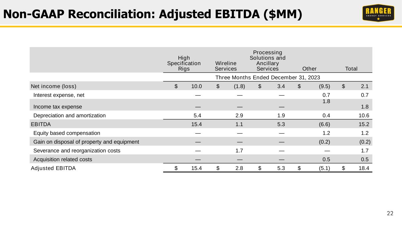 21 High Specification Rigs Wireline Services Processing Solutions and Ancillary Services Other Total Three Months Ended March 31, 2024 Net income (loss) $ 7.8 $ (2.9) $ 0.5 $ (6.2) $ (0.8) Interest expense, net — — — 0.8 0.8 Income tax benefit — — — (0.5) (0.5) Depreciation and amortization 5.6 3.1 2.0 0.5 11.2 EBITDA 13.4 0.2 2.5 (5.4) 10.7 Equity based compensation — — — 1.2 1.2 Gain on disposal of property and equipment — — — (1.3) (1.3) Acquisition related costs 0.2 — — 0.1 0.3 Adjusted EBITDA $ 13.6 $ 0.2 $ 2.5 $ (5.4) $ 10.9 Non-GAAP Reconciliation: Adjusted EBITDA ($MM)