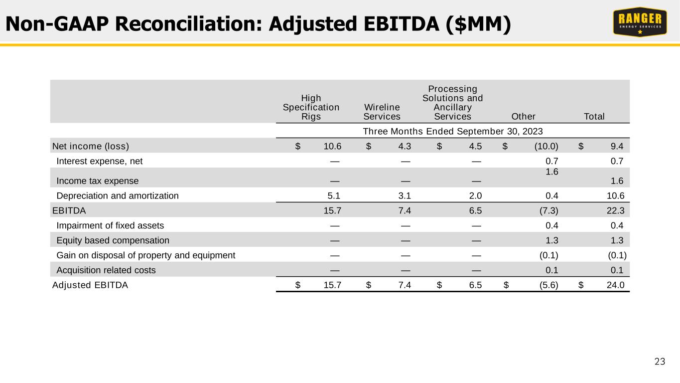 22 High Specification Rigs Wireline Services Processing Solutions and Ancillary Services Other Total Three Months Ended December 31, 2023 Net income (loss) $ 10.0 $ (1.8) $ 3.4 $ (9.5) $ 2.1 Interest expense, net — — — 0.7 0.7 Income tax expense — — — 1.8 1.8 Depreciation and amortization 5.4 2.9 1.9 0.4 10.6 EBITDA 15.4 1.1 5.3 (6.6) 15.2 Equity based compensation — — — 1.2 1.2 Gain on disposal of property and equipment — — — (0.2) (0.2) Severance and reorganization costs — 1.7 — — 1.7 Acquisition related costs — — — 0.5 0.5 Adjusted EBITDA $ 15.4 $ 2.8 $ 5.3 $ (5.1) $ 18.4 Non-GAAP Reconciliation: Adjusted EBITDA ($MM)