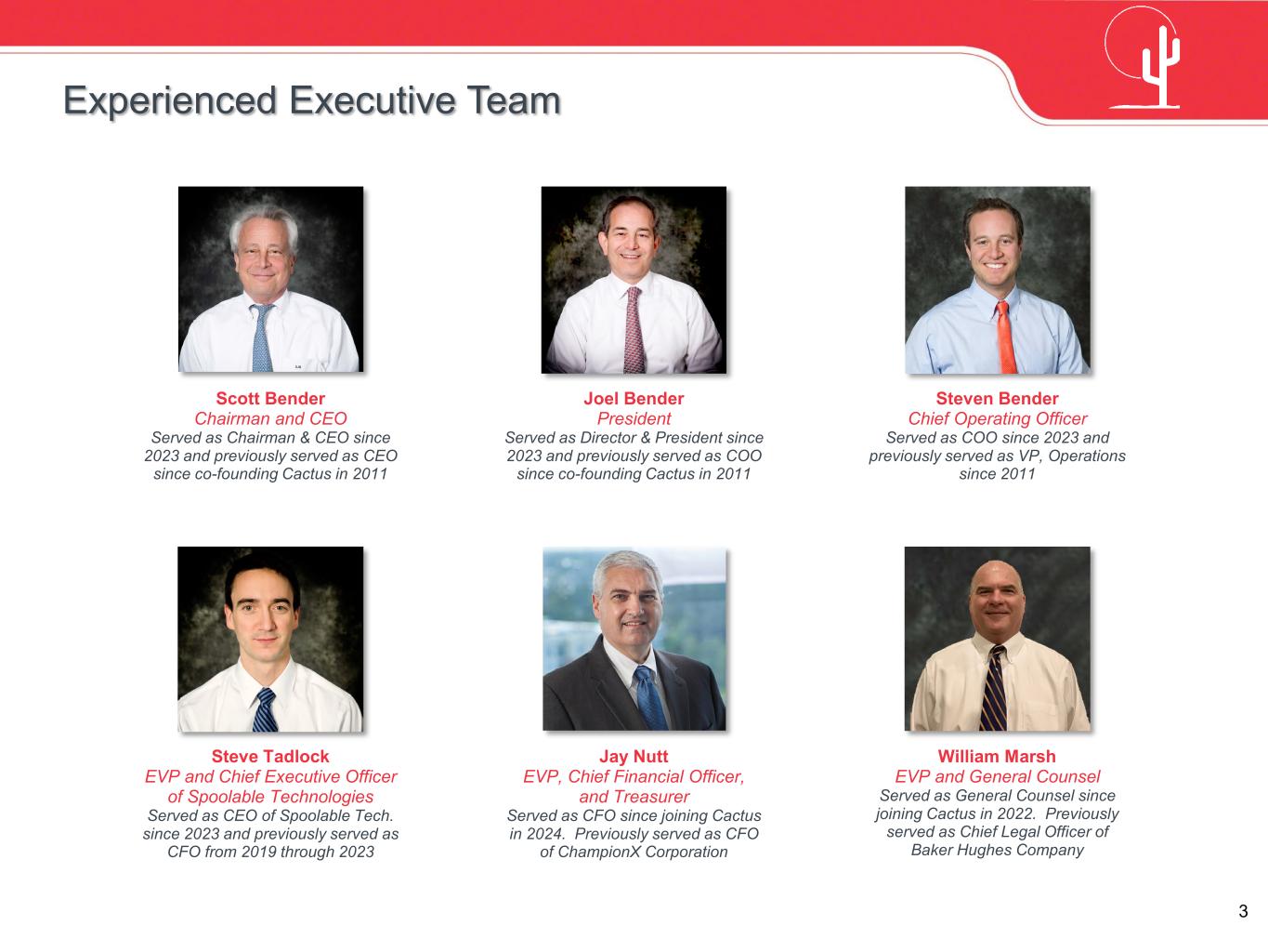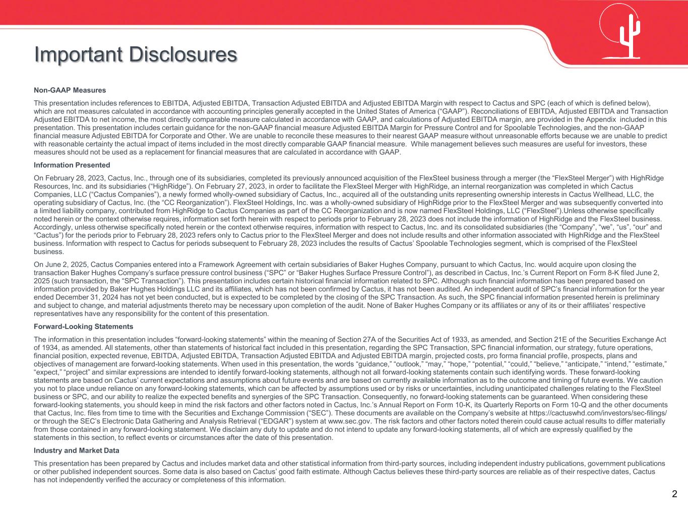 2 Non-GAAP Measures This presentation includes references to EBITDA, Adjusted EBITDA, Transaction Adjusted EBITDA and Adjusted EBITDA Margin with respect to Cactus and SPC (each of which is defined below), which are not measures calculated in accordance with accounting principles generally accepted in the United States of America (“GAAP”). Reconciliations of EBITDA, Adjusted EBITDA and Transaction Adjusted EBITDA to net income, the most directly comparable measure calculated in accordance with GAAP, and calculations of Adjusted EBITDA margin, are provided in the Appendix included in this presentation. This presentation includes certain guidance for the non-GAAP financial measure Adjusted EBITDA Margin for Pressure Control and for Spoolable Technologies, and the non-GAAP financial measure Adjusted EBITDA for Corporate and Other. We are unable to reconcile these measures to their nearest GAAP measure without unreasonable efforts because we are unable to predict with reasonable certainty the actual impact of items included in the most directly comparable GAAP financial measure. While management believes such measures are useful for investors, these measures should not be used as a replacement for financial measures that are calculated in accordance with GAAP. Information Presented On February 28, 2023, Cactus, Inc., through one of its subsidiaries, completed its previously announced acquisition of the FlexSteel business through a merger (the “FlexSteel Merger”) with HighRidge Resources, Inc. and its subsidiaries (“HighRidge”). On February 27, 2023, in order to facilitate the FlexSteel Merger with HighRidge, an internal reorganization was completed in which Cactus Companies, LLC (“Cactus Companies”), a newly formed wholly-owned subsidiary of Cactus, Inc., acquired all of the outstanding units representing ownership interests in Cactus Wellhead, LLC, the operating subsidiary of Cactus, Inc. (the “CC Reorganization”). FlexSteel Holdings, Inc. was a wholly-owned subsidiary of HighRidge prior to the FlexSteel Merger and was subsequently converted into a limited liability company, contributed from HighRidge to Cactus Companies as part of the CC Reorganization and is now named FlexSteel Holdings, LLC (“FlexSteel”).Unless otherwise specifically noted herein or the context otherwise requires, information set forth herein with respect to periods prior to February 28, 2023 does not include the information of HighRidge and the FlexSteel business. Accordingly, unless otherwise specifically noted herein or the context otherwise requires, information with respect to Cactus, Inc. and its consolidated subsidiaries (the “Company”, “we”, “us”, “our” and “Cactus”) for the periods prior to February 28, 2023 refers only to Cactus prior to the FlexSteel Merger and does not include results and other information associated with HighRidge and the FlexSteel business. Information with respect to Cactus for periods subsequent to February 28, 2023 includes the results of Cactus’ Spoolable Technologies segment, which is comprised of the FlexSteel business. On June 2, 2025, Cactus Companies entered into a Framework Agreement with certain subsidiaries of Baker Hughes Company, pursuant to which Cactus, Inc. would acquire upon closing the transaction Baker Hughes Company’s surface pressure control business (“SPC” or “Baker Hughes Surface Pressure Control”), as described in Cactus, Inc.’s Current Report on Form 8-K filed June 2, 2025 (such transaction, the “SPC Transaction”). This presentation includes certain historical financial information related to SPC. Although such financial information has been prepared based on information provided by Baker Hughes Holdings LLC and its affiliates, which has not been confirmed by Cactus, it has not been audited. An independent audit of SPC’s financial information for the year ended December 31, 2024 has not yet been conducted, but is expected to be completed by the closing of the SPC Transaction. As such, the SPC financial information presented herein is preliminary and subject to change, and material adjustments thereto may be necessary upon completion of the audit. None of Baker Hughes Company or its affiliates or any of its or their affiliates’ respective representatives have any responsibility for the content of this presentation. Forward-Looking Statements The information in this presentation includes “forward-looking statements” within the meaning of Section 27A of the Securities Act of 1933, as amended, and Section 21E of the Securities Exchange Act of 1934, as amended. All statements, other than statements of historical fact included in this presentation, regarding the SPC Transaction, SPC financial information, our strategy, future operations, financial position, expected revenue, EBITDA, Adjusted EBITDA, Transaction Adjusted EBITDA and Adjusted EBITDA margin, projected costs, pro forma financial profile, prospects, plans and objectives of management are forward-looking statements. When used in this presentation, the words “guidance,” “outlook,” “may,” “hope,” “potential,” “could,” “believe,” “anticipate,” “intend,” “estimate,” “expect,” “project” and similar expressions are intended to identify forward-looking statements, although not all forward-looking statements contain such identifying words. These forward-looking statements are based on Cactus’ current expectations and assumptions about future events and are based on currently available information as to the outcome and timing of future events. We caution you not to place undue reliance on any forward-looking statements, which can be affected by assumptions used or by risks or uncertainties, including unanticipated challenges relating to the FlexSteel business or SPC, and our ability to realize the expected benefits and synergies of the SPC Transaction. Consequently, no forward-looking statements can be
