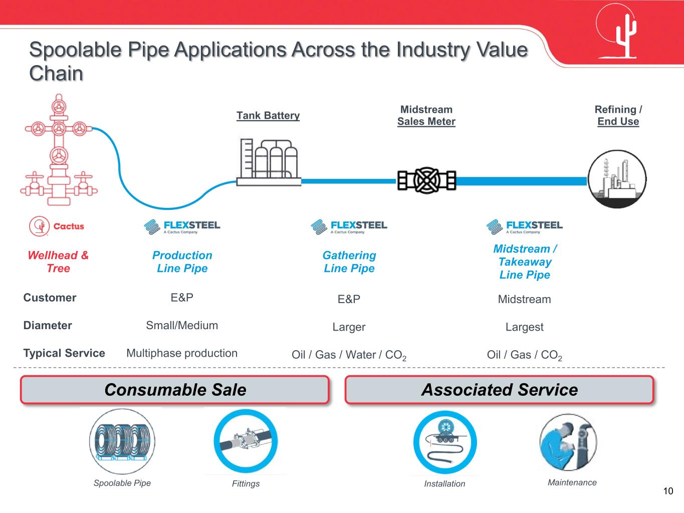 9 Technologically Advanced Spoolable Pipe Systems Lower maintenance cost for operators Lower cost to install Reduces operating field failures / reinstallations Reduces need for special handling or bedding tools Higher flowrates Reliable in extreme conditions Suitable for trenchless pipe installation methods (directional drilling or rehab) Durable and corrosion- resistant Faster installation times Withstands cyclic loading Lowest bend radius of any spoolable pipe Pre-leak detection Large diameter High pressure & temperature ratings Features Operator Savings Conventional Steel Line Pipe FlexSteel Spoolable Pipe FlexSteel Advantages