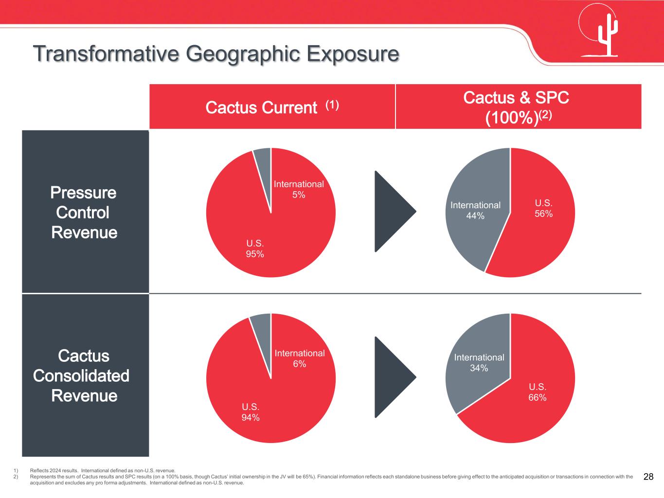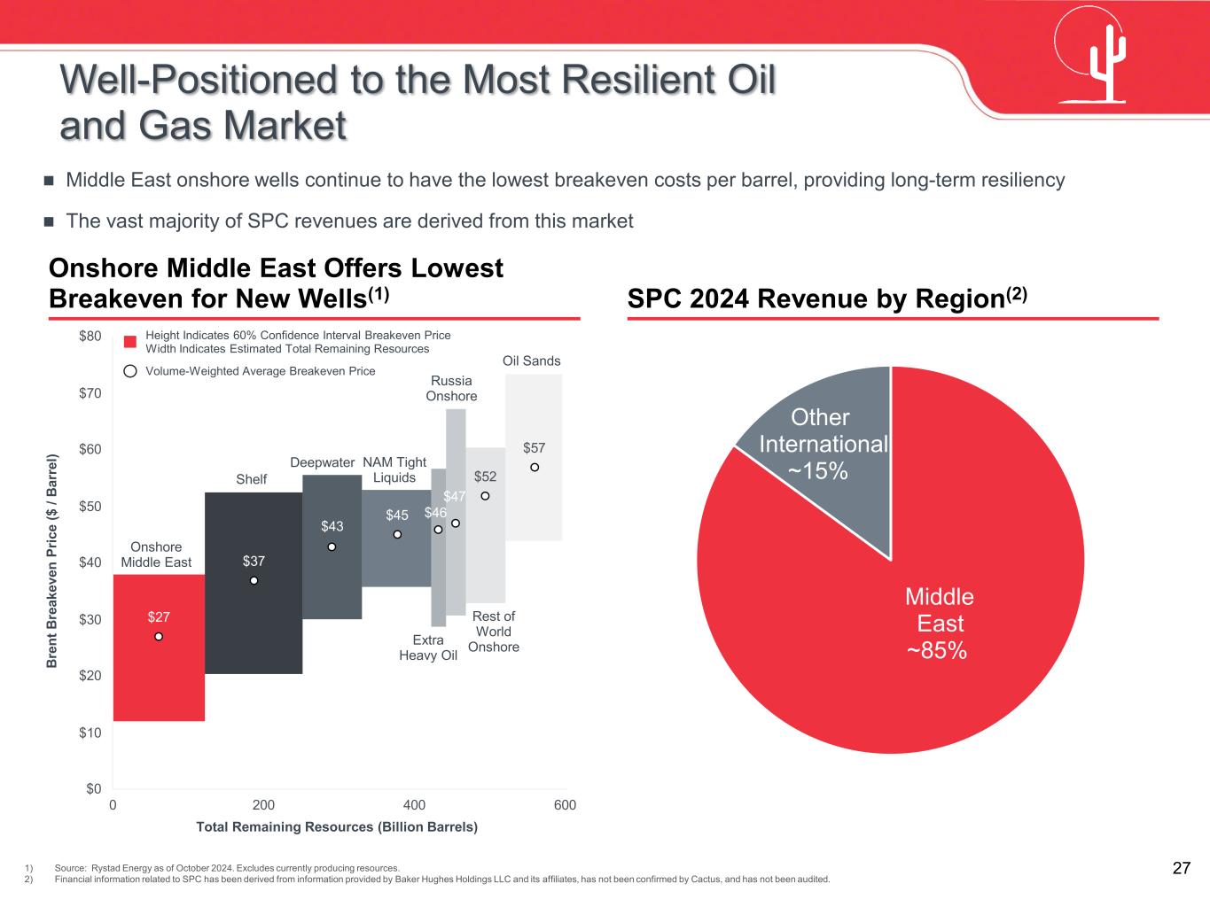 27 Onshore Middle East Shelf Deepwater NAM Tight Liquids Oil Sands Rest of World Onshore Russia Onshore Extra Heavy Oil Total Remaining Resources (Billion Barrels) $27 $37 $43 $45 $46 $47 $52 $57 $0 $10 $20 $30 $40 $50 $60 $70 $80 0 200 400 600 Volume-Weighted Average Breakeven Price Height Indicates 60% Confidence Interval Breakeven Price Width Indicates Estimated Total Remaining Resources B re nt B re ak ev en P ric e ($ / B ar re l) Onshore Middle East Offers Lowest Breakeven for New Wells(1) SPC 2024 Revenue by Region(2) 1) Source: Rystad Energy as of October 2024. Excludes currently producing resources. 2) Financial information related to SPC has been derived from information provided by Baker Hughes Holdings LLC and its affiliates, has not been confirmed by Cactus, and has not been audited. Well-Positioned to the Most Resilient Oil and Gas Market Middle East onshore wells continue to have the lowest breakeven costs per barrel, providing long-term resiliency The vast majority of SPC revenues are derived from this market Middle East ~85% Other International ~15%