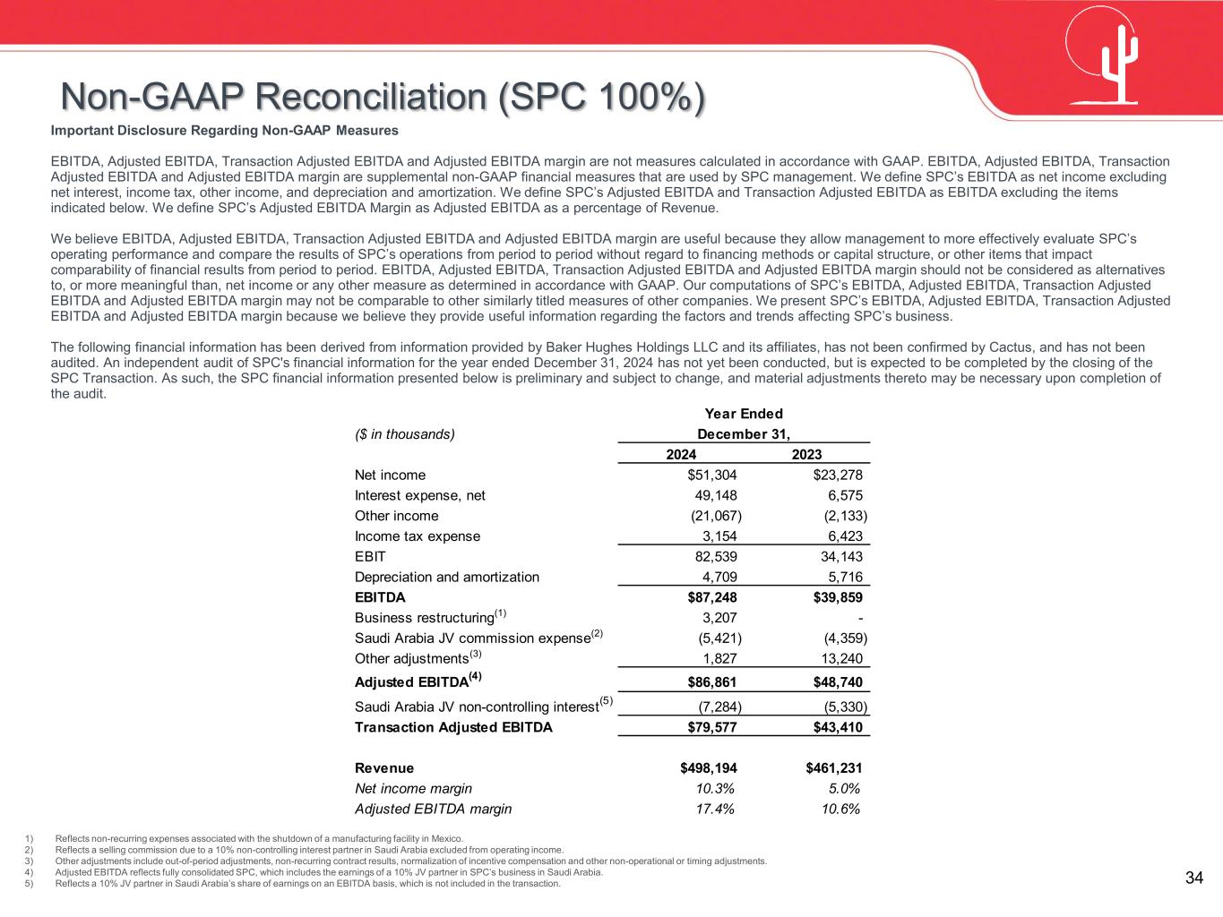 34 Non-GAAP Reconciliation (SPC 100%) Important Disclosure Regarding Non-GAAP Measures EBITDA, Adjusted EBITDA, Transaction Adjusted EBITDA and Adjusted EBITDA margin are not measures calculated in accordance with GAAP. EBITDA, Adjusted EBITDA, Transaction Adjusted EBITDA and Adjusted EBITDA margin are supplemental non-GAAP financial measures that are used by SPC management. We define SPC’s EBITDA as net income excluding net interest, income tax, other income, and depreciation and amortization. We define SPC’s Adjusted EBITDA and Transaction Adjusted EBITDA as EBITDA excluding the items indicated below. We define SPC’s Adjusted EBITDA Margin as Adjusted EBITDA as a percentage of Revenue. We believe EBITDA, Adjusted EBITDA, Transaction Adjusted EBITDA and Adjusted EBITDA margin are useful because they allow management to more effectively evaluate SPC’s operating performance and compare the results of SPC’s operations from period to period without regard to financing methods or capital structure, or other items that impact comparability of financial results from period to period. EBITDA, Adjusted EBITDA, Transaction Adjusted EBITDA and Adjusted EBITDA margin should not be considered as alternatives to, or more meaningful than, net income or any other measure as determined in accordance with GAAP. Our computations of SPC’s EBITDA, Adjusted EBITDA, Transaction Adjusted EBITDA and Adjusted EBITDA margin may not be comparable to other similarly titled measures of other companies. We present SPC’s EBITDA, Adjusted EBITDA, Transaction Adjusted EBITDA and Adjusted EBITDA margin because we believe they provide useful information regarding the factors and trends affecting SPC’s business. The following financial information has been derived from information provided by Baker Hughes Holdings LLC and its affiliates, has not been confirmed by Cactus, and has not been audited. An independent audit of SPC's financial information for the year ended December 31, 2024 has not yet been conducted, but is expected to be completed by the closing of the SPC Transaction. As such, the SPC financial information presented below is preliminary and subject to change, and material adjustments thereto may be necessary upon completion of the audit. 1) Reflects non-recurring expenses associated with the shutdown of a manufacturing facility in Mexico. 2) Reflects a selling commission due to a 10% non-controlling interest partner in Saudi Arabia excluded from operating income. 3) Other adjustments include out-of-period adjustments, non-recurring contract results, normalization of incentive compensation and other non-operational or timing adjustments. 4) Adjusted EBITDA reflects fully consolidated SPC, which includes the earnings of a 10% JV partner in SPC’s business in Saudi Arabia. 5) Reflects a 10% JV partner in Saudi Arabia’s share of earnings on an EBITDA basis, which is not included in the transaction. Year Ended ($ in thousands) December 31, 2024 2023 Net income $51,304 $23,278 Interest expense, net 49,148 6,575 Other income (21,067) (2,133) Income tax expense 3,154 6,423 EBIT 82,539 34,143 Depreciation and amortization 4,709 5,716 EBITDA $87,248 $39,859 Business restructuring(1) 3,207 - Saudi Arabia JV commission expense(2) (5,421) (4,359) Other adjustments(3) 1,827 13,240 Adjusted EBITDA(4) $86,861 $48,740 Saudi Arabia JV non-controlling interest(5) (7,284) (5,330) Transaction Adjusted EBITDA $79,577 $43,410 Revenue $498,194 $461,231 Net income margin 10.3% 5.0% Adjusted EBITDA margin 17.4% 10.6%