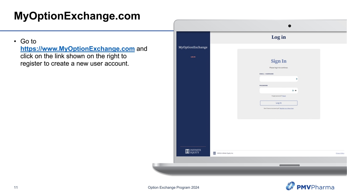 MyOptionExchange.com • Go to https://www.MyOptionExchange.com and click on the link shown on the right to register to create a new user account. 11 Option Exchange Program 2024