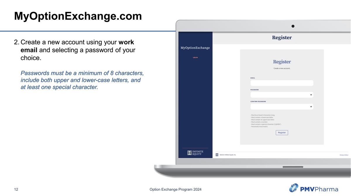 MyOptionExchange.com 2. Create a new account using your work email and selecting a password of your choice. Passwords must be a minimum of 8 characters, include both upper and lower-case letters, and at least one special character. 12 Option Exchange Program 2024