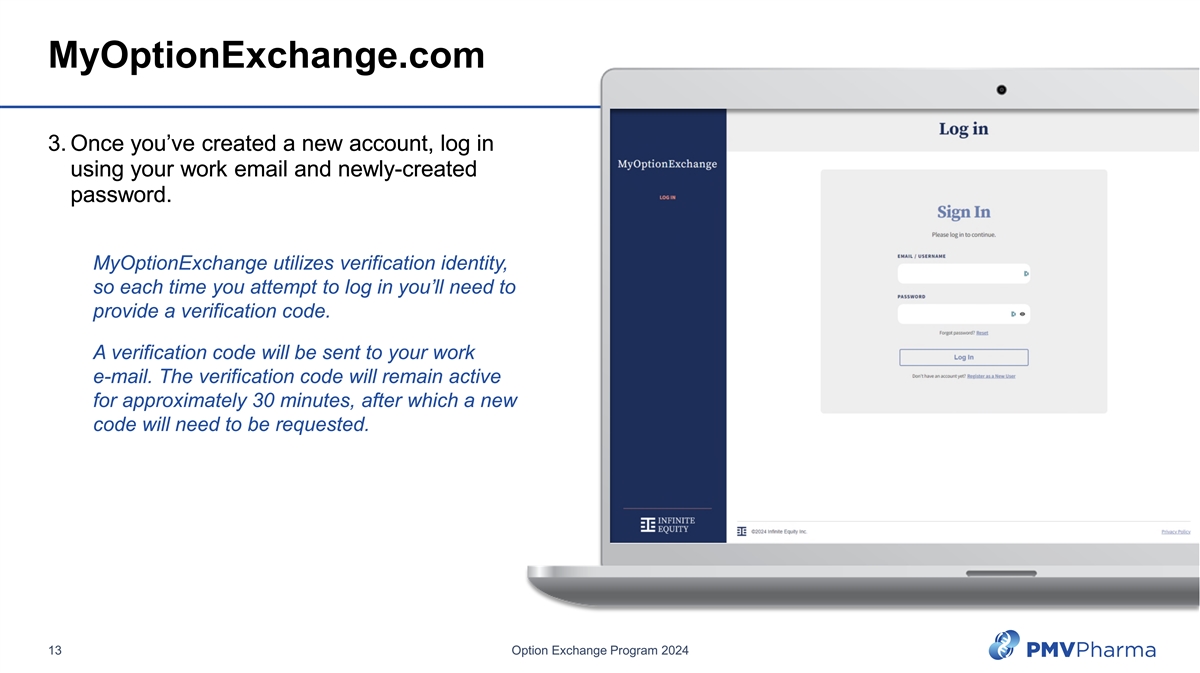 MyOptionExchange.com 3. Once you’ve created a new account, log in using your work email and newly-created password. MyOptionExchange utilizes verification identity, so each time you attempt to log in you’ll need to provide a verification code. A verification code will be sent to your work e-mail. The verification code will remain active for approximately 30 minutes, after which a new code will need to be requested. 13 Option Exchange Program 2024