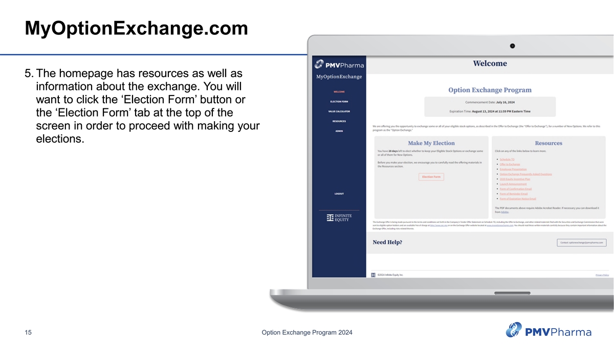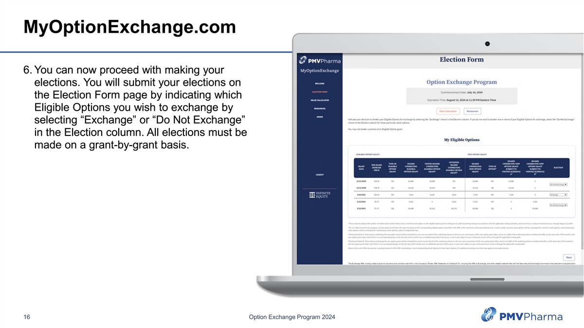 MyOptionExchange.com 5. The homepage has resources as well as information about the exchange. You will want to click the ‘Election Form’ button or the ‘Election Form’ tab at the top of the screen in order to proceed with making your elections. 15 Option Exchange Program 2024