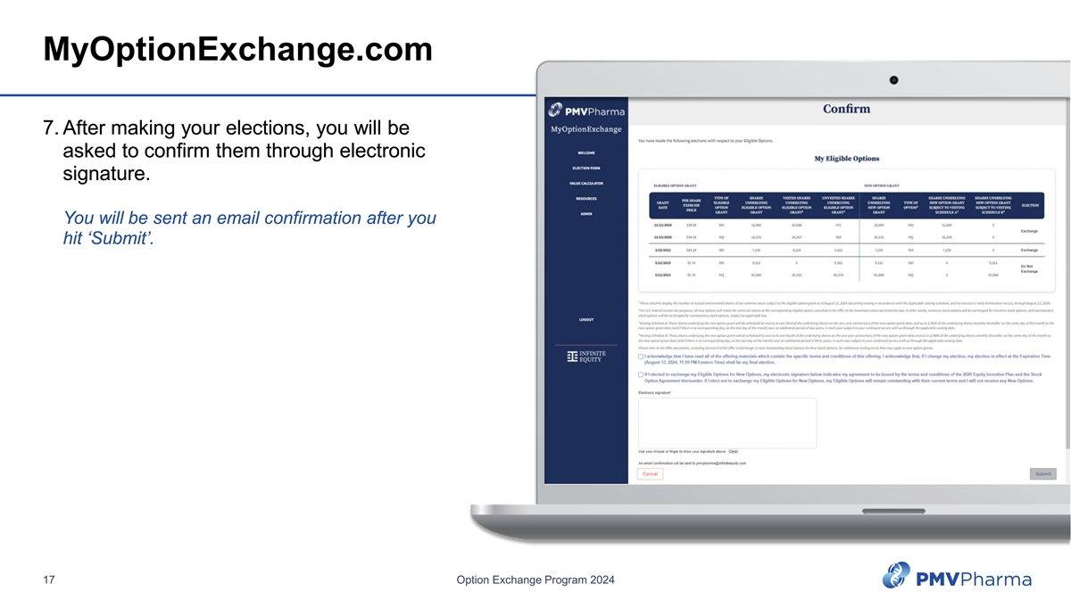MyOptionExchange.com 7. After making your elections, you will be asked to confirm them through electronic signature. You will be sent an email confirmation after you hit ‘Submit’. 17 Option Exchange Program 2024