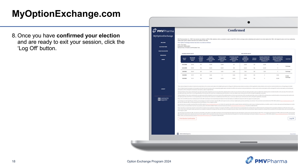 MyOptionExchange.com 8. Once you have confirmed your election and are ready to exit your session, click the ‘Log Off’ button. 18 Option Exchange Program 2024