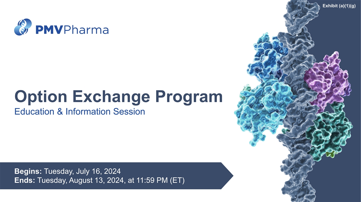 Key Terms & Definitions The number of shares underlying Eligible Options you will need to exchange for New Options (e.g., 1 share underlying an Eligible Exchange Ratio Option for 1 New Option). Eligible Options The Eligible Options that are allowed to be exchanged during the Option Exchange Offer. The last possible time you can elect to participate in the Option Exchange. The Option Exchange is scheduled to expire at 11:59 PM Expiration Time (ET) on August 13, 2024, unless extended. New Options The New Stock Options granted to you, in place of the Eligible Options, if you chose to participate in the Option Exchange. The right to buy shares of PMV Pharmaceuticals, Inc. common stock, at a fixed price (called the Strike Price or Exercise Price) for a Stock Option certain period of time. Strike Price / The price at which PMV Pharmaceuticals, Inc. shares can be purchased upon exercise of a Stock Option. The Strike Price is set when the Stock Option is granted. Exercise Price Underwater A Stock Option that has a Strike Price that is higher than the current price of PMV Pharmaceuticals, Inc. stock. Option The time period in which you must remain in employment or service with PMV Pharmaceuticals, Inc. in order to vest in the New Options Vesting Period received. Any unvested, New Options may be forfeited at the time of a termination of service. 26 Option Exchange Program 2024