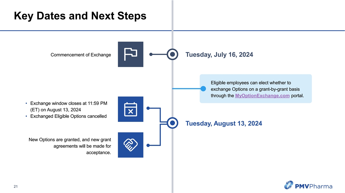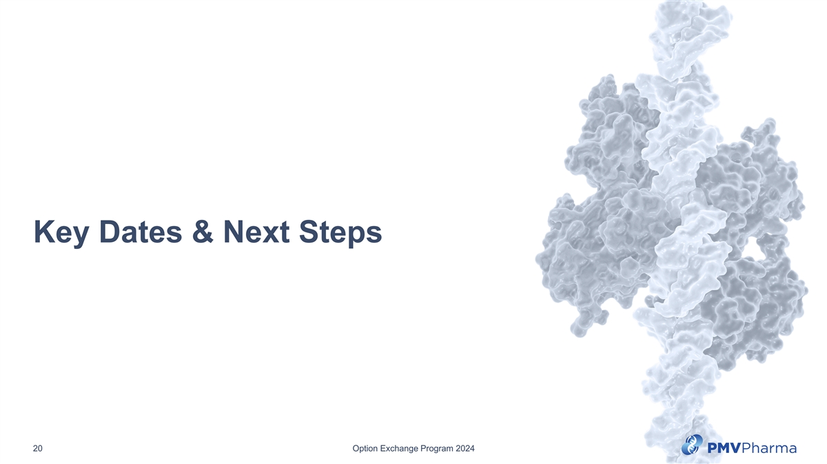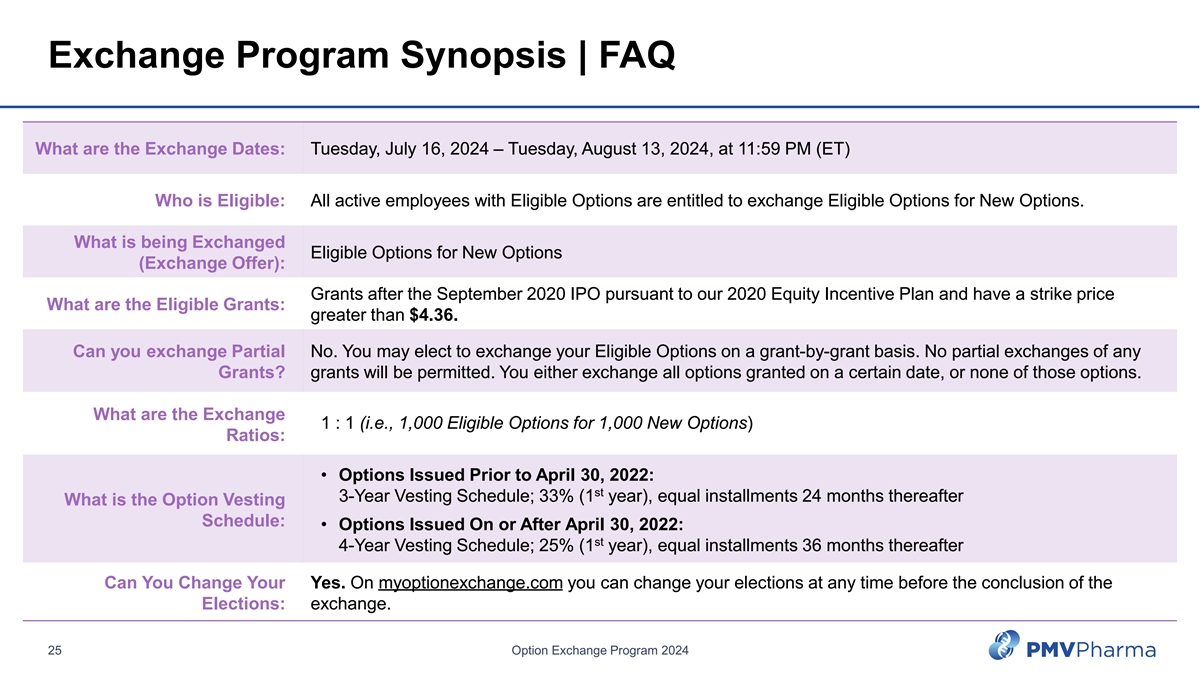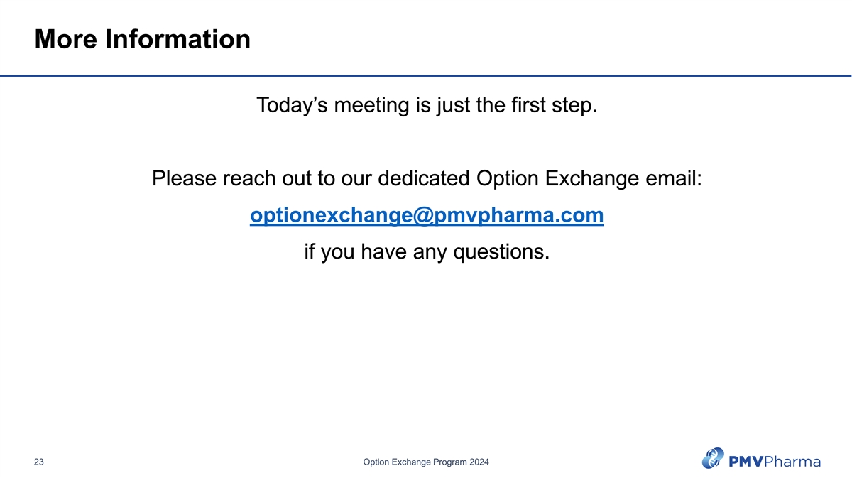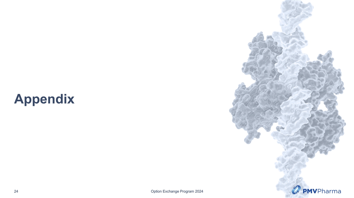 More Information Today’s meeting is just the first step. Please reach out to our dedicated Option Exchange email: optionexchange@pmvpharma.com if you have any questions. 23 Option Exchange Program 2024