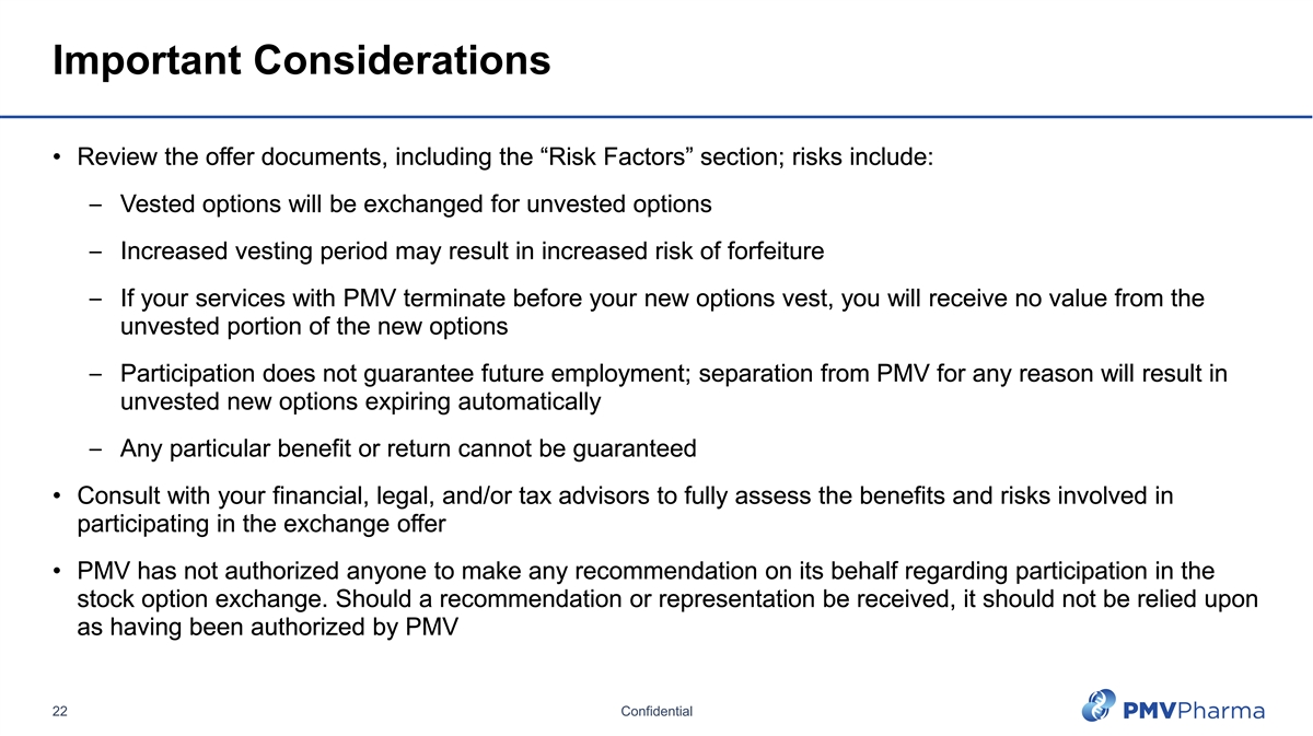Important Considerations • Review the offer documents, including the “Risk Factors” section; risks include: – Vested options will be exchanged for unvested options – Increased vesting period may result in increased risk of forfeiture – If your services with PMV terminate before your new options vest, you will receive no value from the unvested portion of the new options – Participation does not guarantee future employment; separation from PMV for any reason will result in unvested new options expiring automatically – Any particular benefit or return cannot be guaranteed • Consult with your financial, legal, and/or tax advisors to fully assess the benefits and risks involved in participating in the exchange offer • PMV has not authorized anyone to make any recommendation on its behalf regarding participation in the stock option exchange. Should a recommendation or representation be received, it should not be relied upon as having been authorized by PMV 22 Confidential