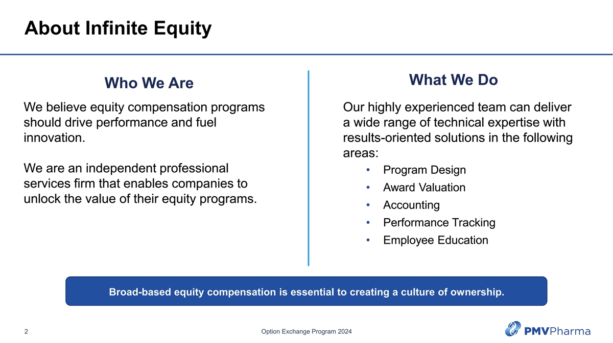 About Infinite Equity What We Do Who We Are We believe equity compensation programs Our highly experienced team can deliver should drive performance and fuel a wide range of technical expertise with innovation. results-oriented solutions in the following areas: We are an independent professional • Program Design services firm that enables companies to • Award Valuation unlock the value of their equity programs. • Accounting • Performance Tracking • Employee Education Broad-based equity compensation is essential to creating a culture of ownership. 2 Option Exchange Program 2024