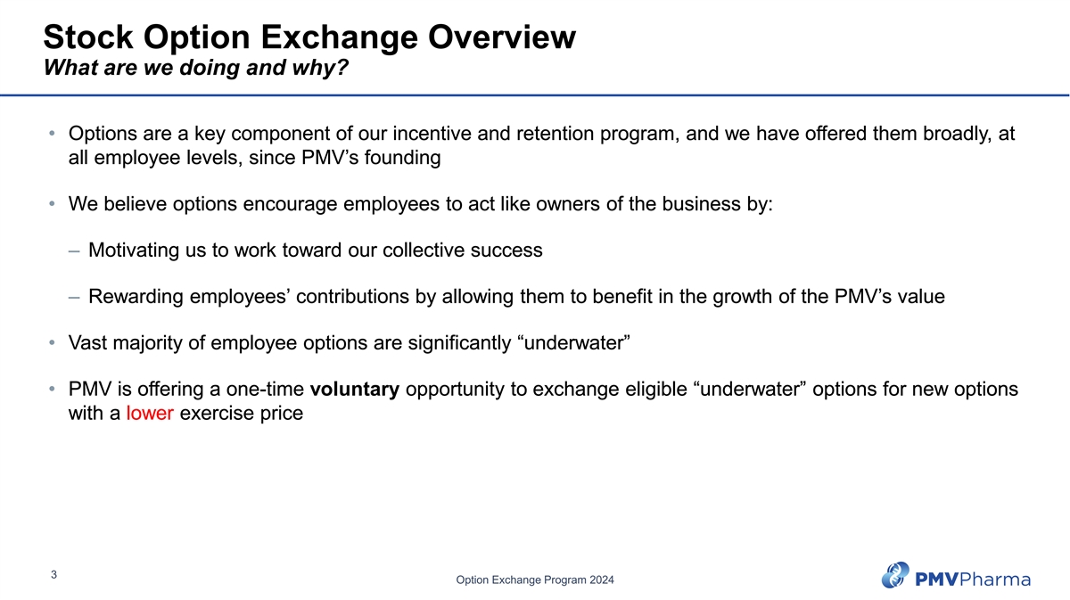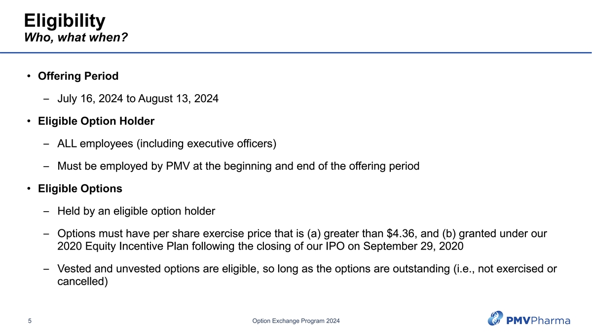 Stock Option Exchange Overview What are we doing and why? • Options are a key component of our incentive and retention program, and we have offered them broadly, at all employee levels, since PMV’s founding • We believe options encourage employees to act like owners of the business by: – Motivating us to work toward our collective success – Rewarding employees’ contributions by allowing them to benefit in the growth of the PMV’s value • Vast majority of employee options are significantly “underwater” • PMV is offering a one-time voluntary opportunity to exchange eligible “underwater” options for new options with a lower exercise price 3 Option Exchange Program 2024