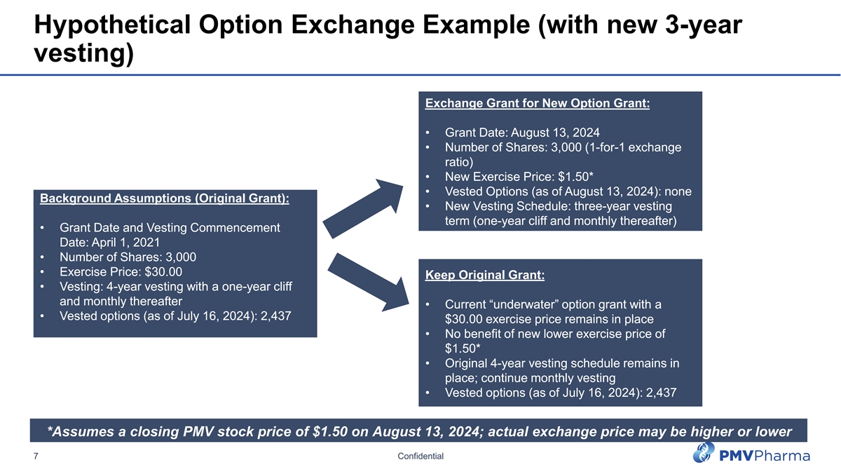 New Options How many, how much, and how long? • Exchange Ratio – Elected eligible options exchanged at a 1:1 ratio – Example: Electing to exchange an eligible option covering 100 shares results in receiving a new option covering 100 shares at a new lower exercise price • Exercise Price per Share – Closing stock price of PMV at the expiration of the offering period (i.e., August 13, 2024, unless extended) • Vesting – All new option grants will be unvested and will be required to restart their vesting period – For original grants granted prior to April 30, 2022, three-year vesting term (one-year cliff and monthly thereafter) – For original grants made on or after April 30, 2022, four-year vesting term (one-year cliff and monthly thereafter) – All vesting is subject to continued service with PMV • Maximum Option Term – 10 years from the new grant date on August 13, 2024 (unless extended) All New Options granted under and subject to terms of PMV’s 2020 Equity Incentive Plan 6 Option Exchange Program 2024