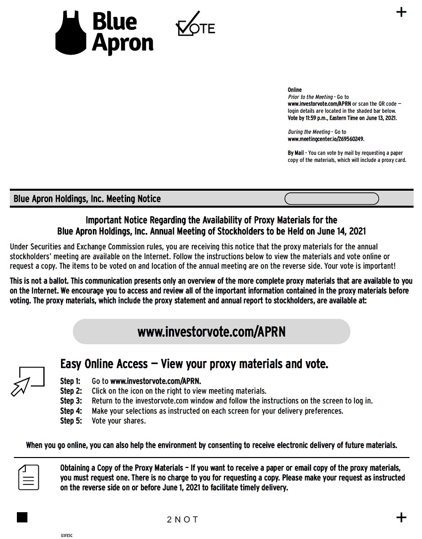 Blue Apron Holdings, Inc. Meeting Notice Blue Apron Holdings, Inc.’s Annual Meeting of Stockholders will be held on Monday, June 14, 2021 at 10:00 A.M. Eastern Time, virtually via the internet at www.meetingcenter.io/269560249. To access the virtual meeting, you must have the information that is printed in the shaded bar located on the reverse side of this form. The password for this meeting is APRN2021. Proposals to be voted on at the meeting are listed below along with the Board of Directors’ recommendations. The Board of Directors recommends that you vote FOR all of the nominees listed and FOR Proposals 2 and 3: 1. Election of Directors Nominees 01 – Linda F. Kozlowski 02 – Barry Salzberg 2. To ratify the appointment of Ernst & Young LLP as our independent registered public accounting firm for the fiscal year ending December 31, 2021 3. To approve an amendment to our restated certificate of incorporation, as amended, to declassify our board of directors NOTE: In their discretion, the Proxies are authorized to vote upon such other business as may properly come before the Annual Meeting or any adjournment or postponement thereof. PLEASE NOTE – YOU CANNOT VOTE BY RETURNING THIS NOTICE. To vote your shares you must go online or request a paper copy of the proxy materials to receive a proxy card. Here’s how to order a copy of the proxy materials and select delivery preferences: Current and future delivery requests can be submitted using the options below. You will otherwise not receive a paper or email copy. If you request an email copy, you will receive an email with a link to the current meeting materials. PLEASE NOTE: You must use the number in the shaded bar on the reverse side when requesting a copy of the proxy materials. — Internet – Go to www.investorvote.com/APRN. — Phone – Call us free of charge at 1-866-641-4276. — Email – Send an email to investorvote@computershare.com with “Proxy Materials Blue Apron Holdings, Inc.” in the subject line. Include your full name and address, plus the number located in the shaded bar on the reverse side, and state that you want a paper copy of the meeting materials. To facilitate timely delivery, requests for a paper copy of proxy materials must be received by June 1, 2021.