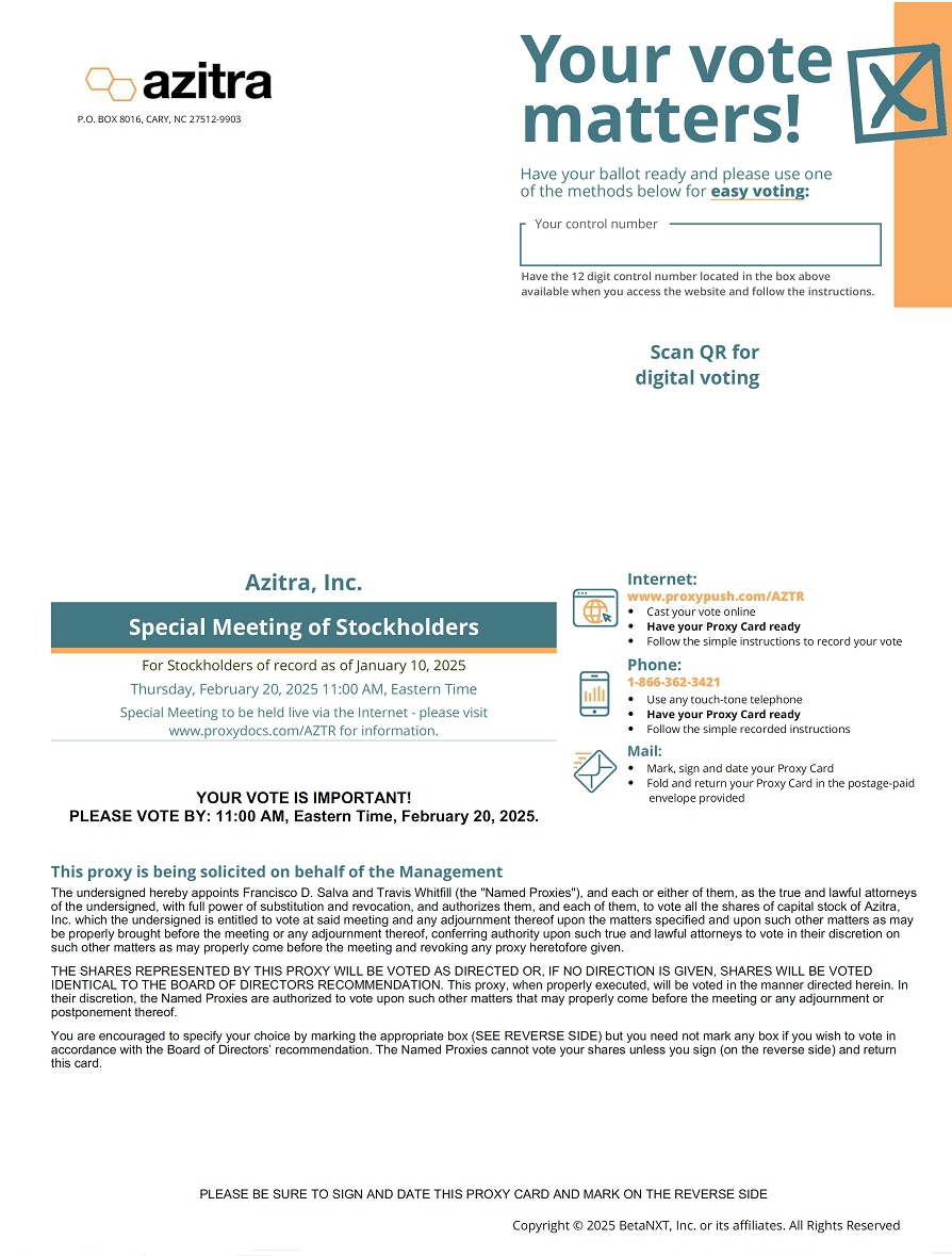 A Special Meeting of Stockholders (which we refer to as the “Special Meeting”) of Azitra, Inc., a Delaware corporation (which we refer to as “Azitra,” “we,” “us,” “our,” or the “Company”), will be held on Thursday, February 20, 2025 at 11:00 a.m. EST. The Special Meeting is a virtual stockholder meeting conducted exclusively via a live audio webcast. Stockholders will be able to attend and listen to the Special Meeting live, submit questions and vote their shares electronically at the Special Meeting from virtually any location around the world. In order to attend the Special Meeting, you must register in advance at www.proxypush.com/AZTR prior to the deadline of 5:00 p.m. EST on Tuesday, February 18, 2025. Upon completing your registration, you will receive further instructions via email, including your unique links that will allow you access to the Special Meeting and will permit you to submit questions.