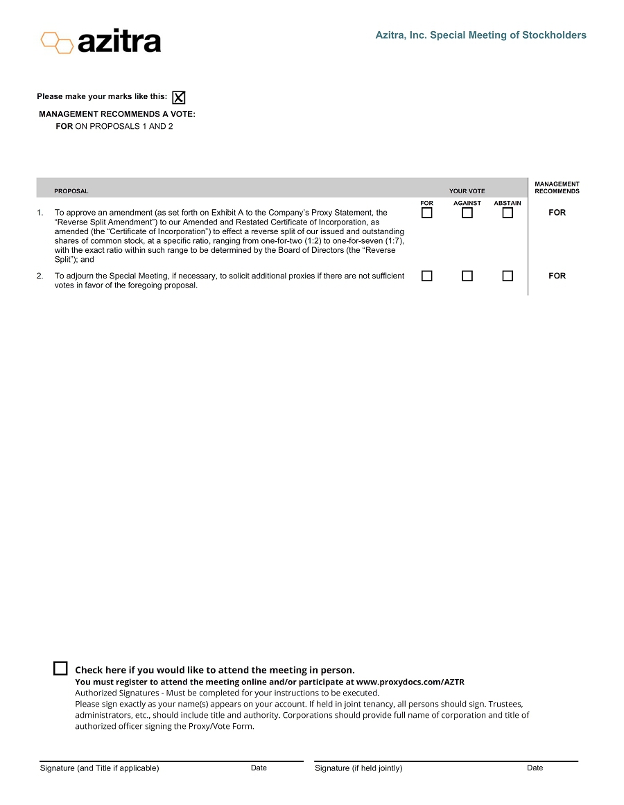 If you plan to attend the Special Meeting, you may vote online by visiting www.proxypush.com/AZTR. Please have your 12-digit control number to join the Special Meeting.